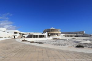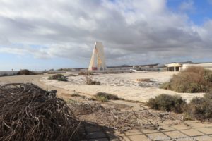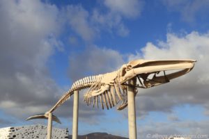 Wir fuhren auf Salinas del Carmen zu, um uns am Meer das Wal-Skelett anzusehen. Eigentlich ist dieses Skelett mehr oder minder im Bereich des Salzmuseums aufgestellt. Zwei Schilder standen auf den Wegen und wiesen darauf hin, dass man den Museumseingang nutzen soll. Doch wir hielten uns rechts der Abmauerung und somit unmittelbar am Meer (die Schilder standen auf dem Weg links neben uns).