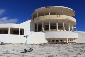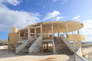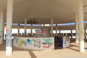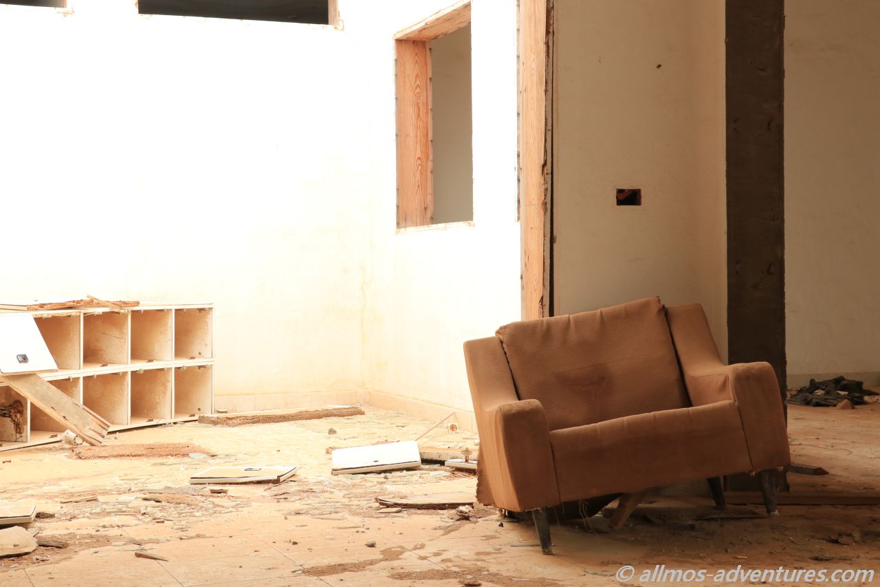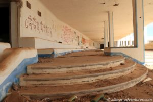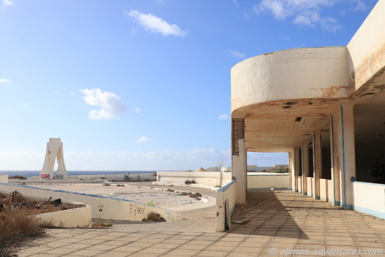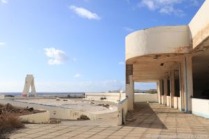 Auf einer großen Fläche befand sich neben einem Pool mit verschiedenen Höhen, auch ein großer Liegebereich am Rand des Beckens. Toiletten und Duschen waren zerstört worden und die Scheiben (als Absturzsicherung) an dem Runden Turm (vermutlich als Restaurant genutzt) lagen auf dem Boden.