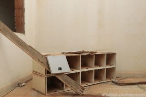 In den Katakomben entdeckten wir Palettenweise Fliesenkleber oder anderen Mörtel, Farbeimer und Lampenfassungen. Auf einem Kanister stand ein Datum von Mai 2000.