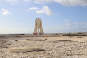 Bei der Tagesplanung für heute hatte ich gestern entdeckt, dass es nördlich von Salinas del Carmen, in Nuevo Horizonte ein ehemaliges Salzwasser Schwimmbad gibt. Dieses mussten wir uns natürlich ansehen. Im Zickzack-Kurs fuhren wir durch die Bebauung. Wir parkten unmittelbar an dem schmalen Zugang zu dem Schwimmbad.