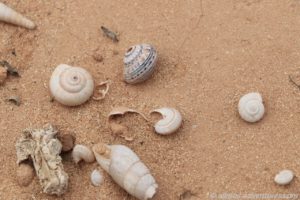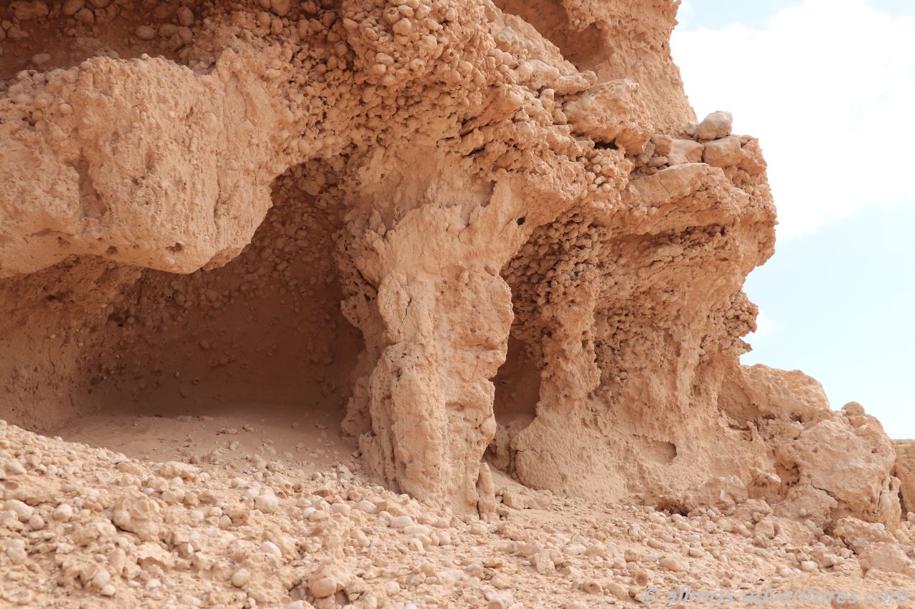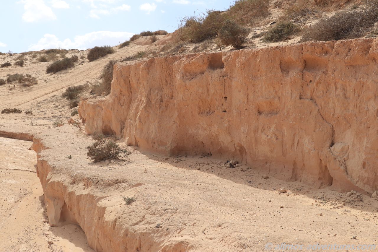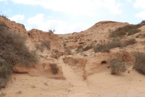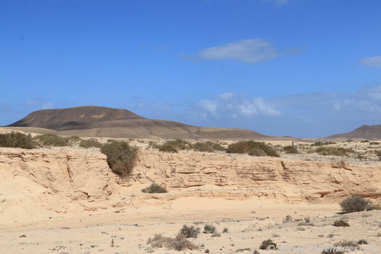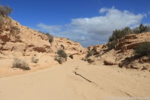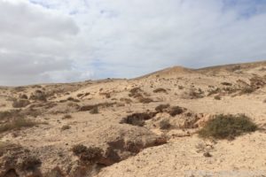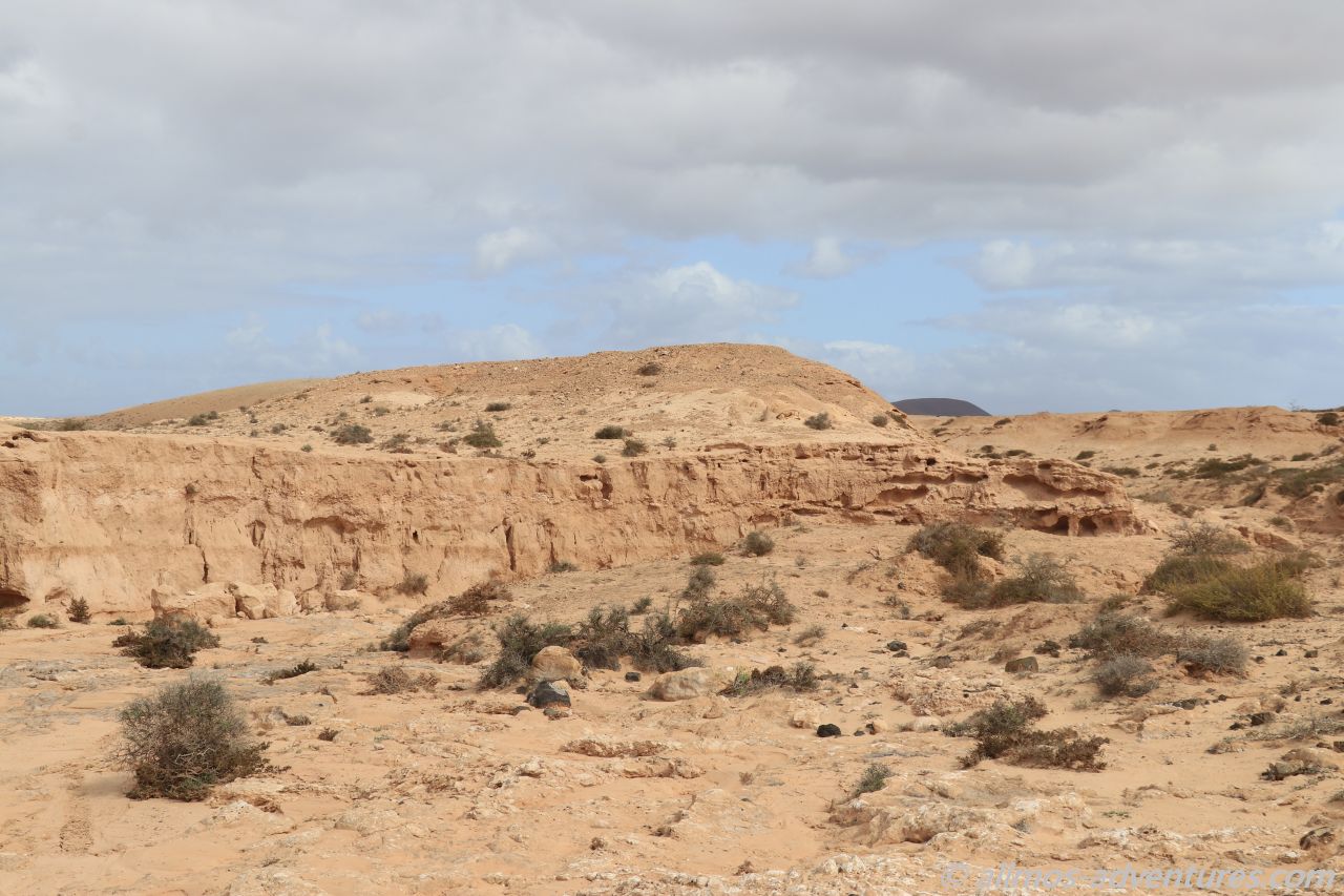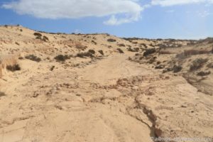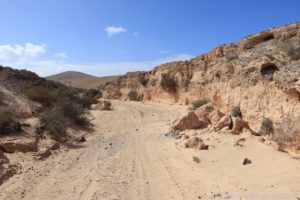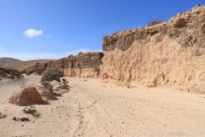 Im Barranco de Cho Cruz waren die Seitenwände wieder etwas höher, neben Sandstein bestand die obere Schicht der Felsen aus einem Kieselstein-Gemisch. Rechts zweigte die Piste ab und führte im Verlauf nach El Cotillo (so sah die Wikiloc Strecke es vor). Wir blieben jedoch noch etwas im Flussbett. An einer breiten Stelle stellten wir Allmo ab und gingen noch ein Stück zu Fuß weiter. Dieses Flussbett war deutlich interessanter als das mittlere, aber das erste war wohl doch für unseren Geschmack am schönsten.