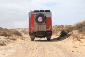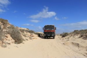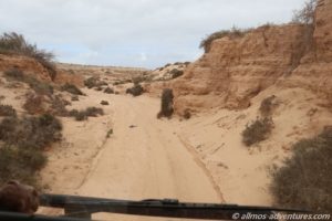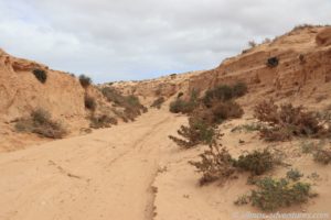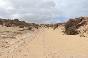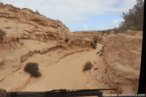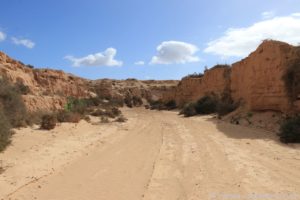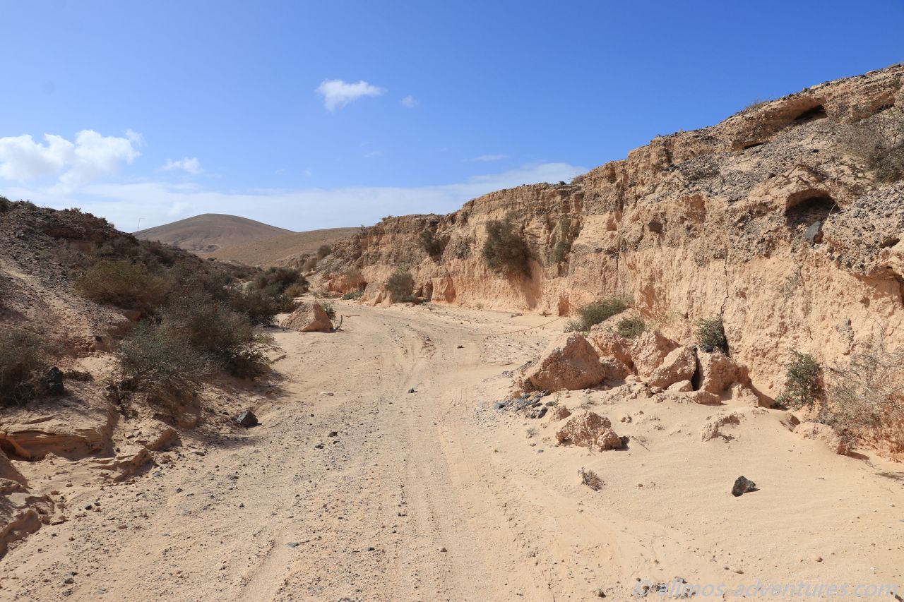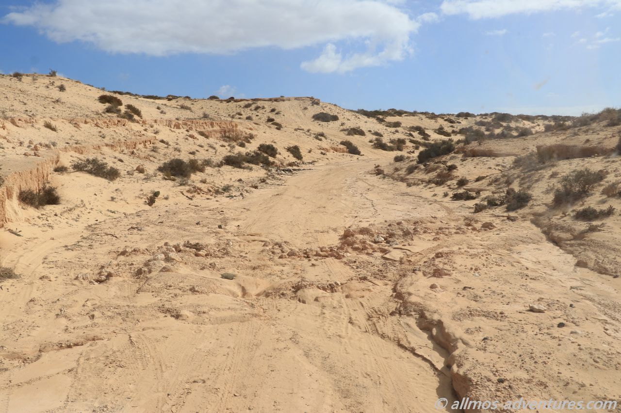 In einem Kreisverkehr mit eigentlich drei Ausfahrten (zumindest auf Teer), nahmen wir die Vierte. Diese führte geradewegs über eine holprige und sandige Piste ins Flussbett Canada de Melian. Dieses war an der Stelle sehr breit und staubtrocken.