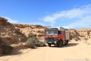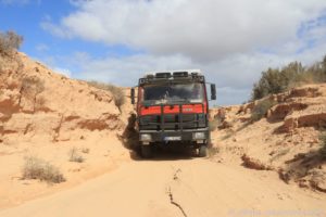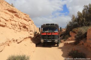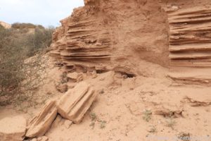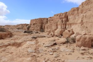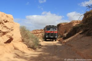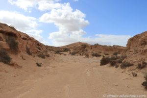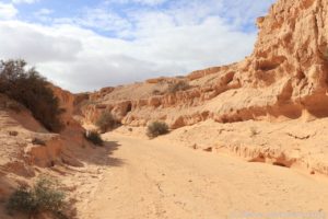 Über Wikoloc hatte ich auch nichts finden können, wie weit die Piste befahrbar ist. Wir ließen uns also überraschen. Das breite Flussbett wurde immer schmaler und rechts und links neben uns wuchsen die Sandsteinfelsen zu einer schönen Höhe an. Durch Erosionen mit Ecken und Kanten versehen, gaben sie ein herrliches Bild ab.