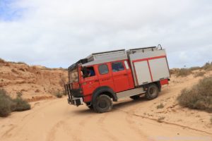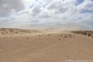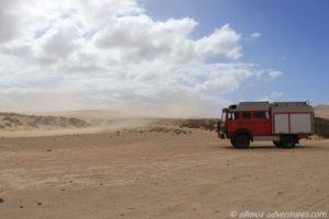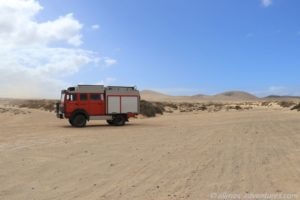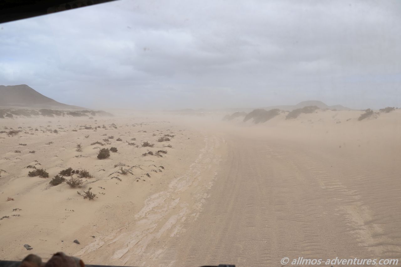 Wie gut, dass wir durch die Flussbetten noch ohne diese Aufwirbelungen fahren konnten. Während wir an dem drei-Seitenarme-Eck standen, erhielten wir eine Whats App von der Fährgesellschaft, mit der wir Morgen von Corralejo nach Lobos Übersetzen wollten. Aufgrund der gemeldeten Wetterbedingungen (hoher Wellengang) wäre das Anlegen in Lobos nicht ohne Risiken möglich und die Fahrt ist abgesagt. Wir könnten Umbuchen (wobei für Donnerstag die 14 Uhr Rückfahrt nicht mehr frei ist) oder würden den Fährpreis zu 100 % erstattet bekommen.
