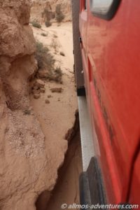 Leider standen die Felsen auch immer näher zusammen und nach ein paar Kurven war ich skeptisch, ob wir nicht besser den Rückwärtsgang einlegen sollten. Wir starteten zu einer Begehung und entschieden uns dafür, den Engpass zu passieren und dahinter zu drehen. Das wäre deutlich entspannter, als rückwärts aus dem engen Flussbett rauszusetzten.