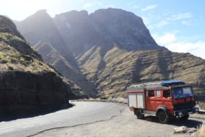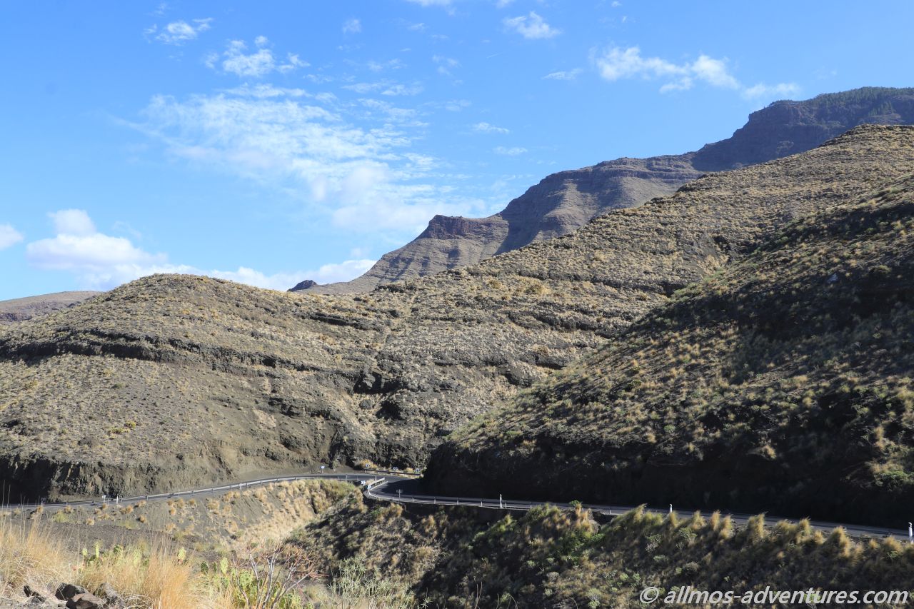 Um zum Mirador de Guayedra zu gelangen, folgten wir der kurvigen Bergstraße. Ein wenig mulmig war mir schon dabei. Gestern und auch heute konnten wir immer wieder die dicken 40-Tonnen LKWs hupen hören, wenn sie um die Kurven fuhren. Und welch ein Tempo die draufhatten. Das Hupen war auch eher nur zur Deko, zumindest hatten wir den Eindruck. Sie hupten so spät vor der Kurve, dass bei einem Gegen-Hupen kaum eine Reaktionsmöglichkeit gewesen wäre. Auch mit welchem Tempo sie in die Kurven gingen war geradezu unheimlich.