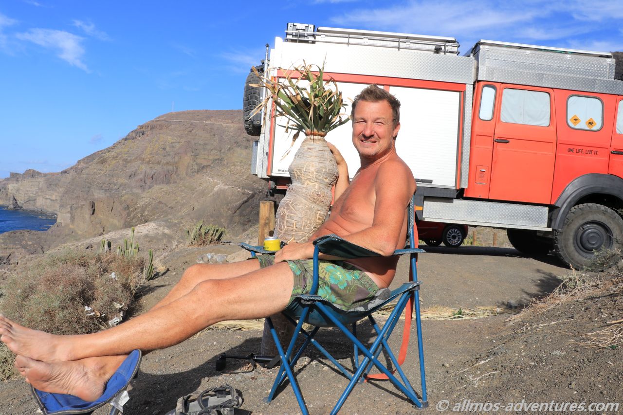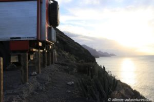 Am Berg entlang führte eine schmale Fahrspur zum Mirador de Guayedra. Auf der kleinen Fläche parkten bereits drei Pkw und ein Van. Wir parkten Allmo ganz rechts am Rand, doch so standen wir sehr schräg.