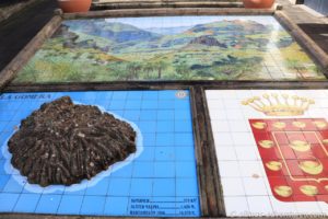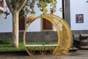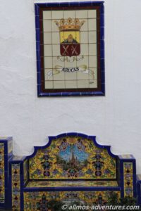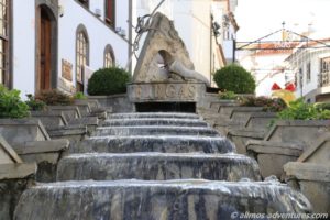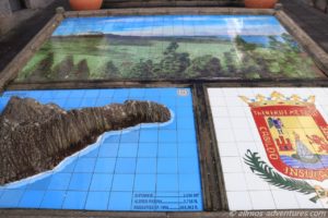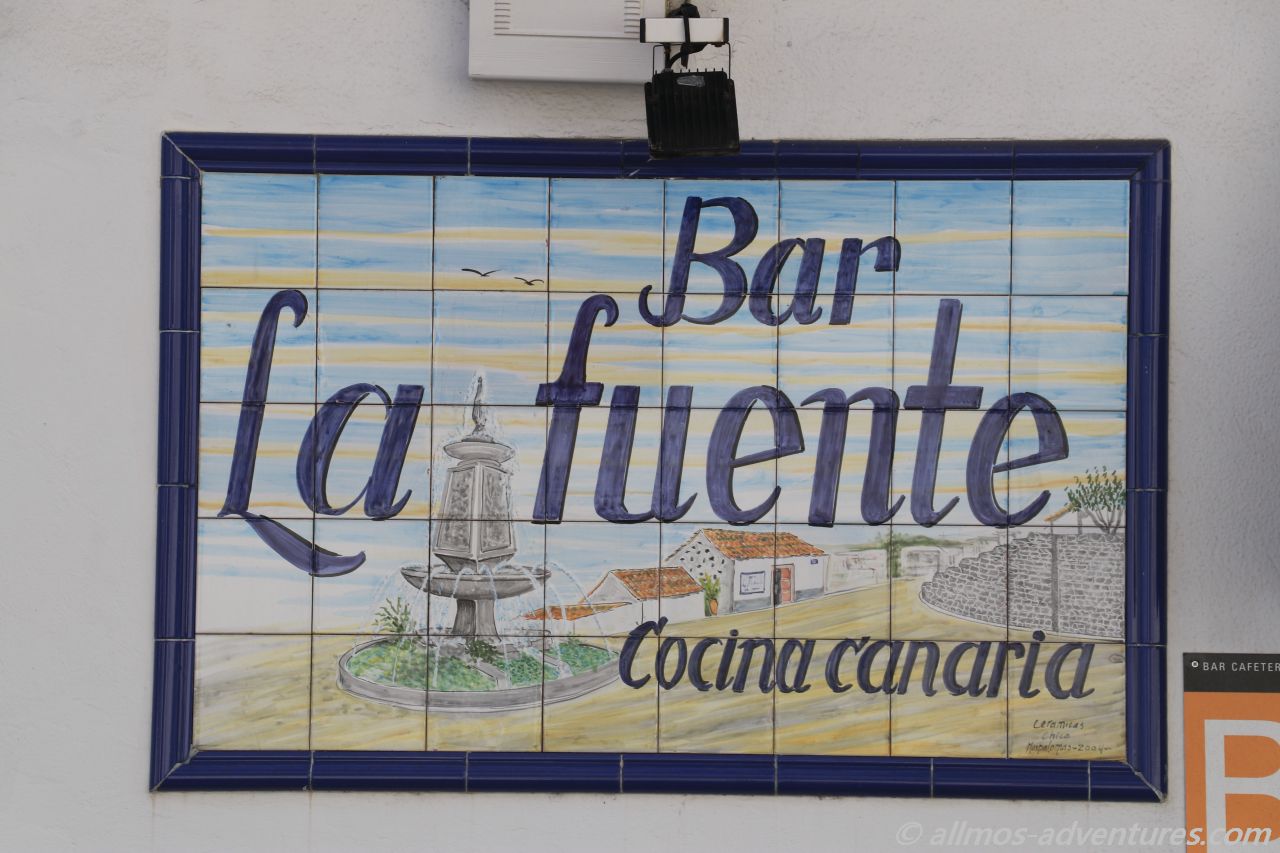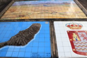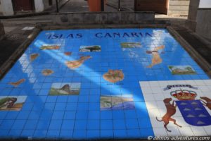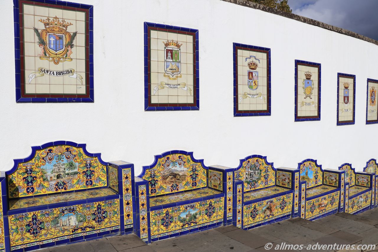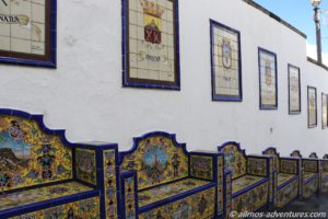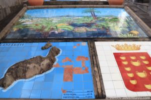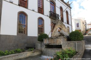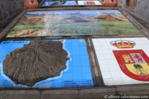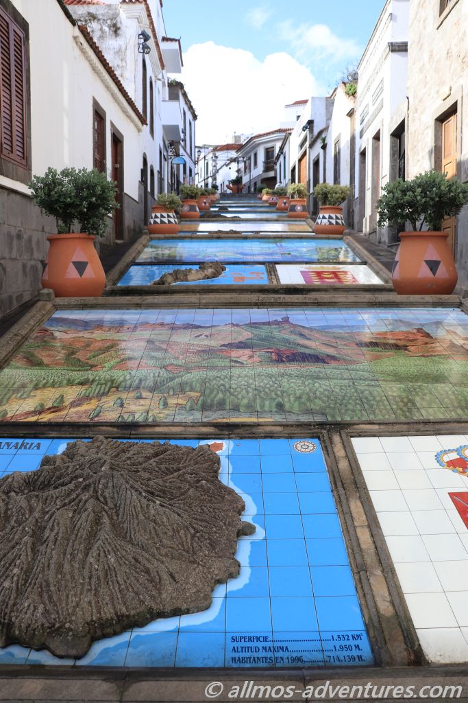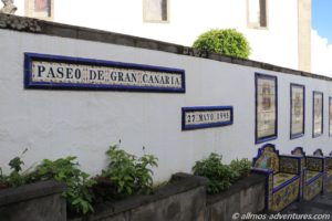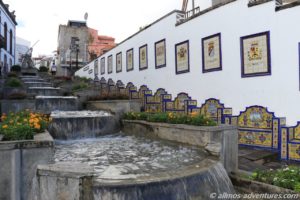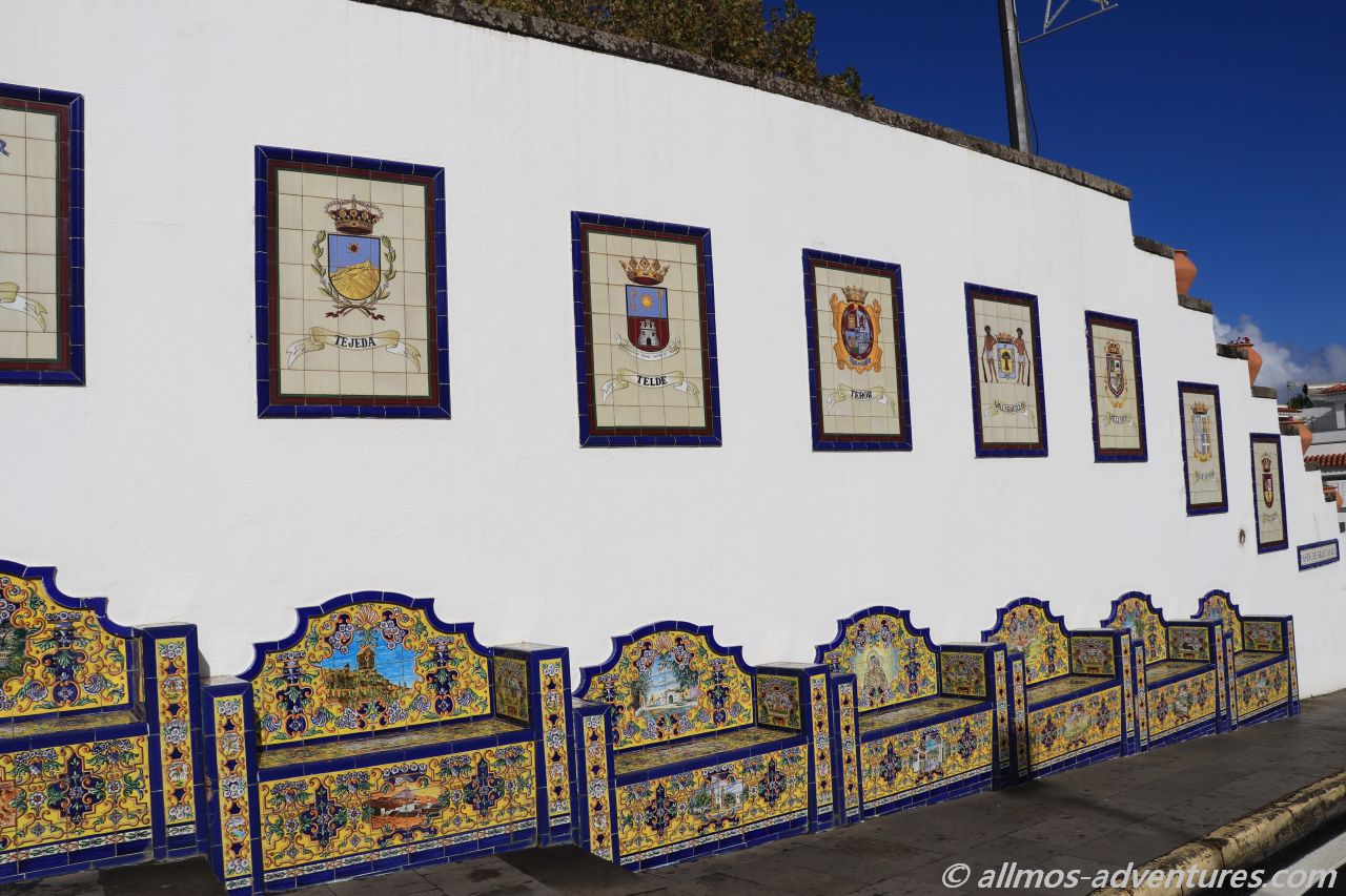 Die wichtigsten Attraktionen von Firgas, einer Wasserstadt, waren schnell erkundet. Besonderes Highlight von Firgas ist der Wasserfall-Brunnen, dessen Wasser treppenartig den Paseo de Gran Canaria hinunterfließt. Entlang dieses Treppen-Brunnens stehen mit bunten Kacheln verzierte Bänke. Über den Bänken hängen an der Wand die Wappen der 21 Gemeinden von Gran Canaria. Und die jeweils darunter befindliche Bank zeigt die Hauptsehenswürdigkeiten dieser Gemeinde. Total schön und interessant war dies gestaltet.