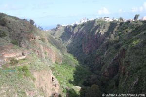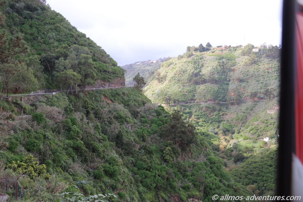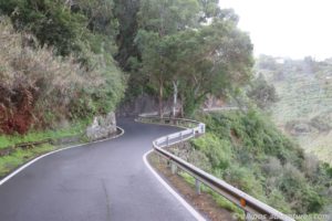 Über eine sehr beeindruckende Bergstraße, zwischen Felsen zur Linken und dem sehr grünen Barranco Azuaje zur Rechten – welches durch die hohen Felsen zu beiden Seiten wunderschön eingerahmt wurde, ging es unserem nächsten Ziel entgegen. Zum Fotos machen kam ich nicht, weil ich mit Franks Videomaschine filmen und gleichzeitig schauen musste, wo unser Ziel liegt. Das die Parksituation schwierig sein könnte, war für mich klar, doch es gab auf dieser relativ schmalen Bergstraße in der Nähe unseres geplanten Wanderstartpunktes (bei einer Brücke am Scheitelpunkt der Bergstraße) aber so gar keine Möglichkeit Allmo für mehrere Stunden guten Gewissens abzustellen.