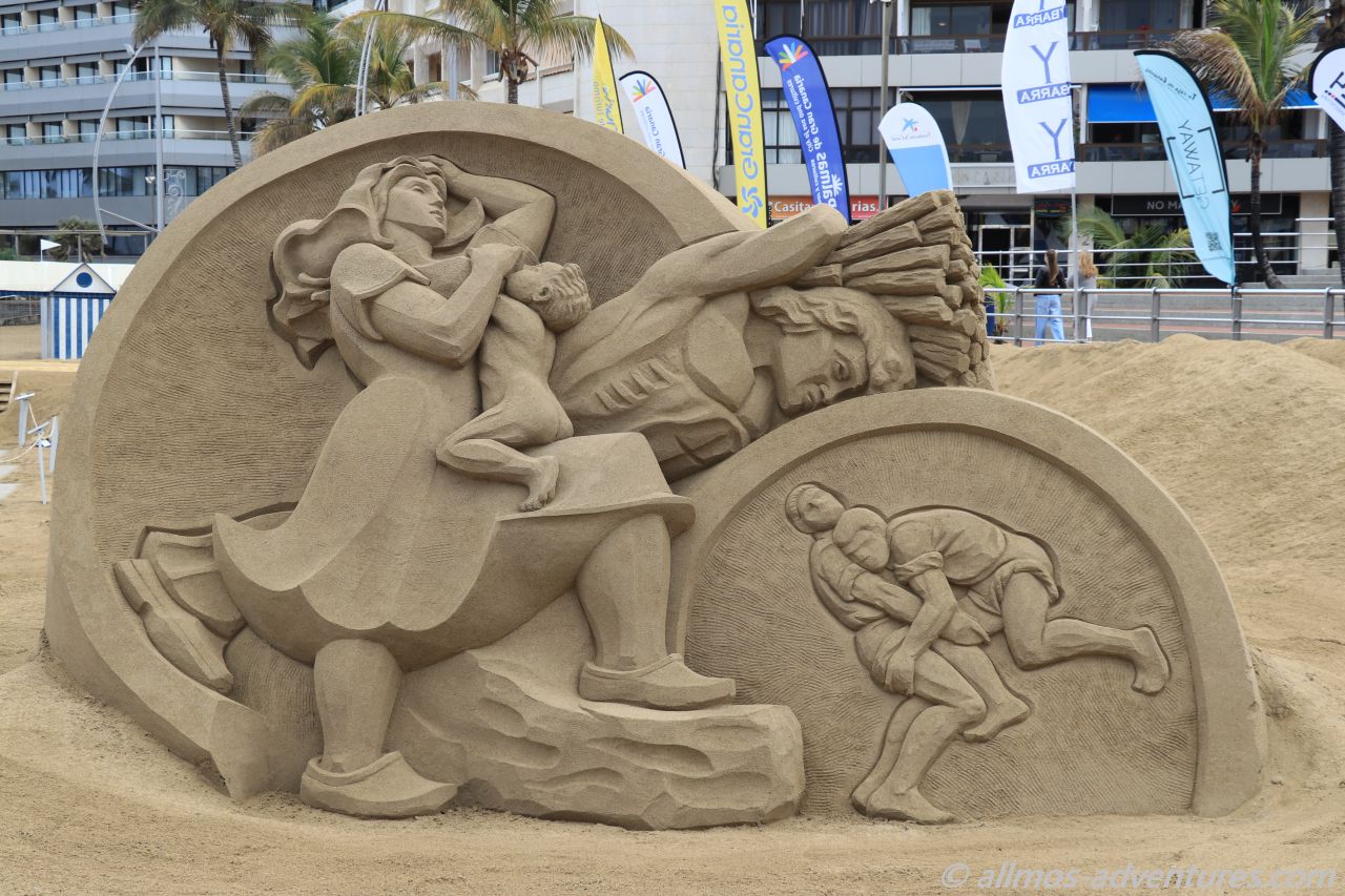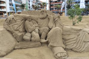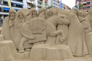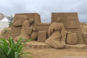 Vielleicht waren meine Erwartungen an die Sandkrippe zu hoch gewesen, aber irgendwie hat sie mich nicht so begeistert, wie gestern die Krippe in Galdar. Klar ist es sehr beeindruckend, wie aus Sand diese Figuren geschaffen wurden, mehr als lebensgroße Menschen, Esel und andere Tiere. Ausdrucksstarke Mimiken, scharfe Konturen. Doch mit den Häusern im Hintergrund und der Anordnung verfehlte die Krippe bei uns ihre Wirkung. Schade.