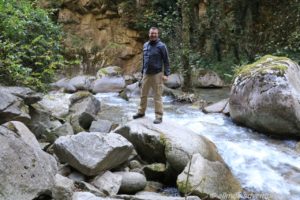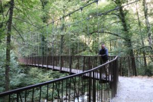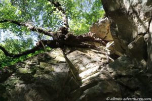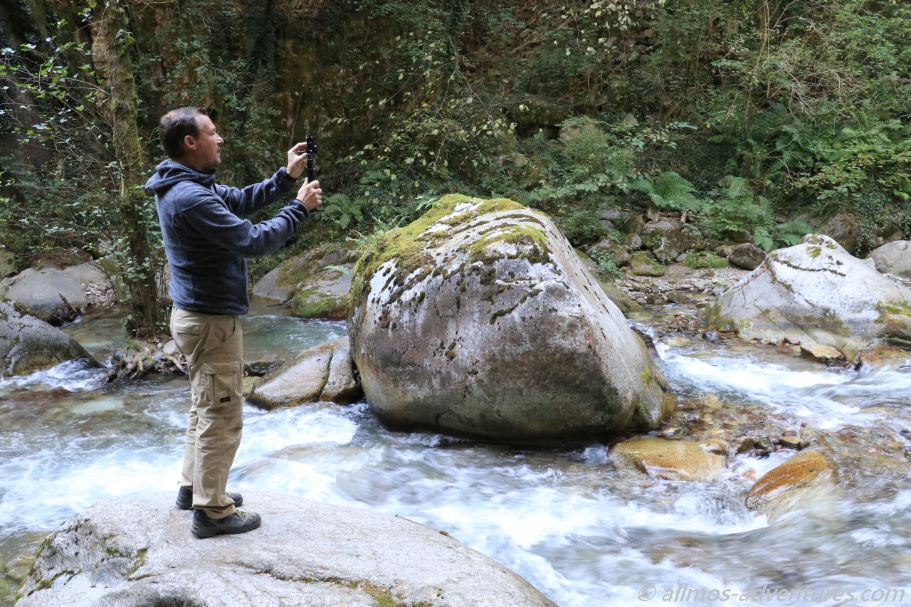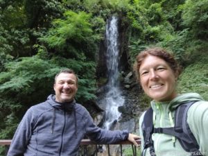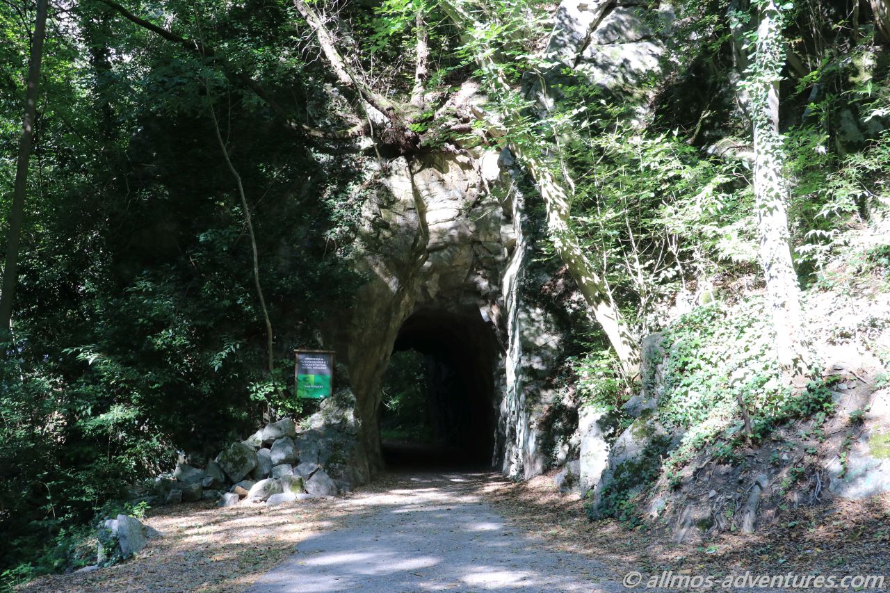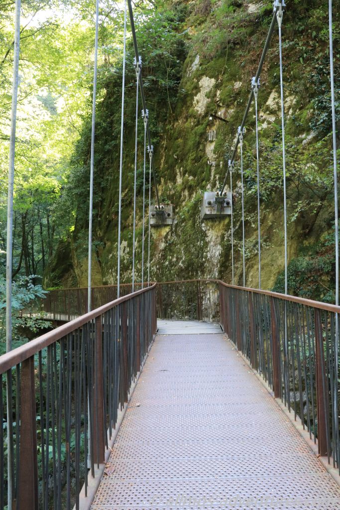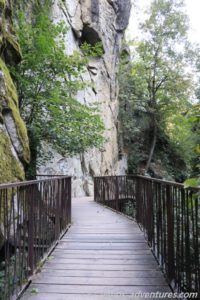 Wir stellten unsere Räder neben einem Geländer an einem Fluss ab und folgten dem Wanderweg entlang des Flusses für rund einen Kilometer. Teilweise führte der Weg über am Felsen befestigte Plattformen und über Hängebrücken. Sehr interessant war der schmale, in den Felsen geschlagene Tunnel, durch den tatsächlich ein Auto fuhr. Befand sich dahinter doch tatsächlich ein Haus.