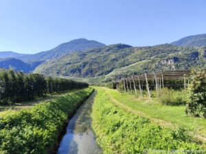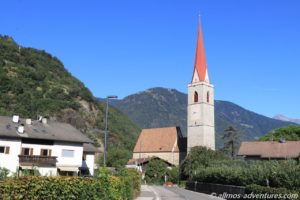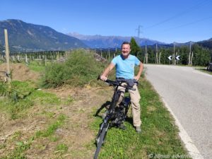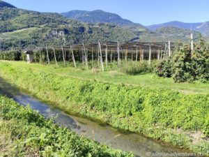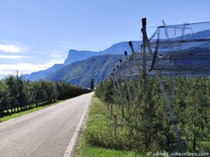 Vor uns lagen ca. 65 Kilometer, die uns durch den Vinschgau, in Richtung Lana brachten. Gefühlt besteht das ganze Vinschgau aus Apfelplantagen. Rechts und links der Straße reihte sich eine Plantage an die nächste. Die Äpfel leuchteten grün, rot und sogar lila.