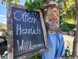 An unserem Ziel, dem Restaurant Pircher angekommen, folgte eine kurze Ernüchterung. Der Parkplatz war voll von Pkws und auch ein paar Camper standen schon im Weg herum. Die vorhandenen Plätze für Camper, hinter dem Gasthaus, waren alle belegt. Aber wir konnten auf einer Fläche neben einer Apfelplantage parken. Auch für diesen Platz, abseits der eigentlichen Fläche, zahlten wir 15 Euro.