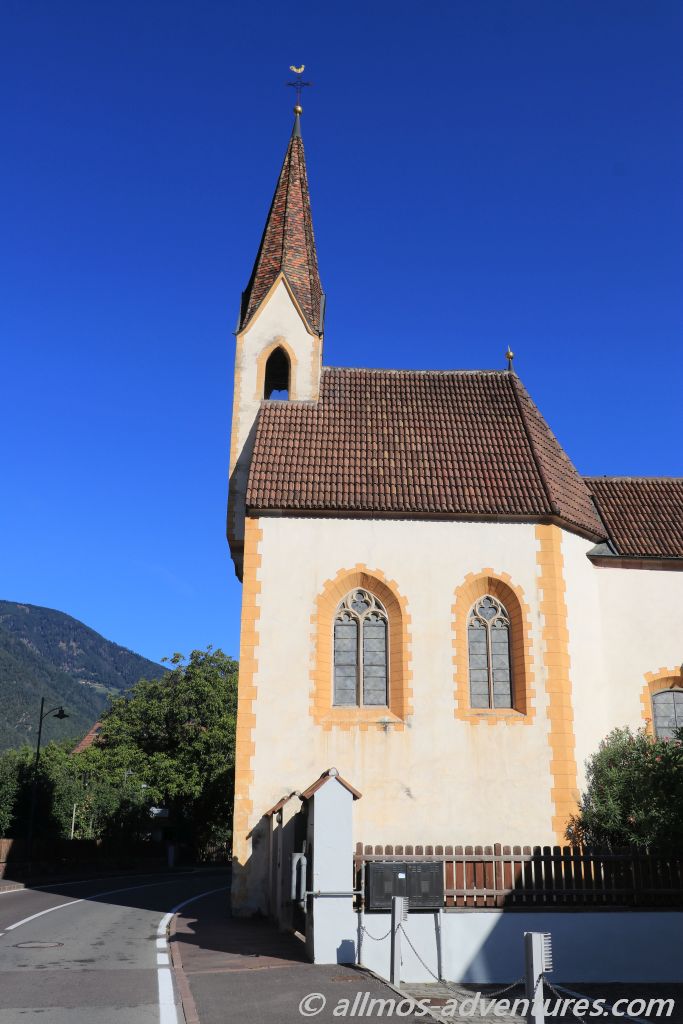 Wir folgten dem Straßenverlauf für rund 8 Kilometer durch – wie sollte es anders sein – Apfelplantagen. Hohe Berge umranden das Tal. Die Landschaft ist einfach nur idyllisch und das Wetter ein Traum.
