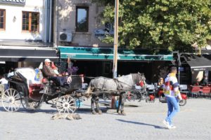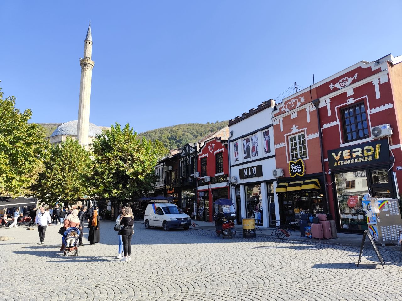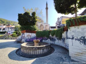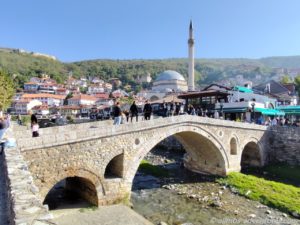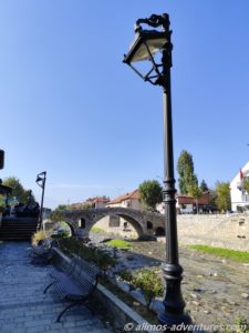 Sehr touristisch wurde es dann, als ich in den Bereich vor dem Platz bei der alten Steinbrücke erreichte. Wie auch schon in Gjakova haben die kleinen Läden Holzfassaden. Aber es ist alles viel moderner, kein Laden steht leer, alles ist für den Touristen nett hergerichtet. Auf dem Platz wartete ein älterer Herr mit einer Pferdekutsche, um Touristen durch die Stadt zu fahren. Im Vorbeilaufen erklärte mir ein anderer Herr auf Englisch, dass diese Kutschen so nur im Kosovo zu finden sind und Gig genannt werden.