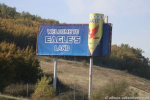 Große grüne Tafeln wiesen darauf hin, dass die Autobahn mautpflichtig ist. Ist sie in Wirklichkeit jedoch nicht. Nachdem die Autobahn fertiggestellt war und die Schilder standen, war wohl kein Geld mehr übrig für die Mautstationen. Auch die angekündigten Raststätten (in 2 km, in 1 km, in 500 m) fehlen. Zufahrt zur und Abfahrt von den angedachten Raststätten sind zu erkennen. Doch dazwischen befindet sich ausschließlich Natur. Das ist ja auch alle mal schöner, als wenn dort schon eine Fläche gerodet und betoniert worden wäre und dann würde es mit der Bebauung nicht weiter voran gehen. Dann doch lieber nur Natur. Warum aber jemand so eifrig war die Schilder zu bestellen und zu setzen, muss man nicht verstehen.