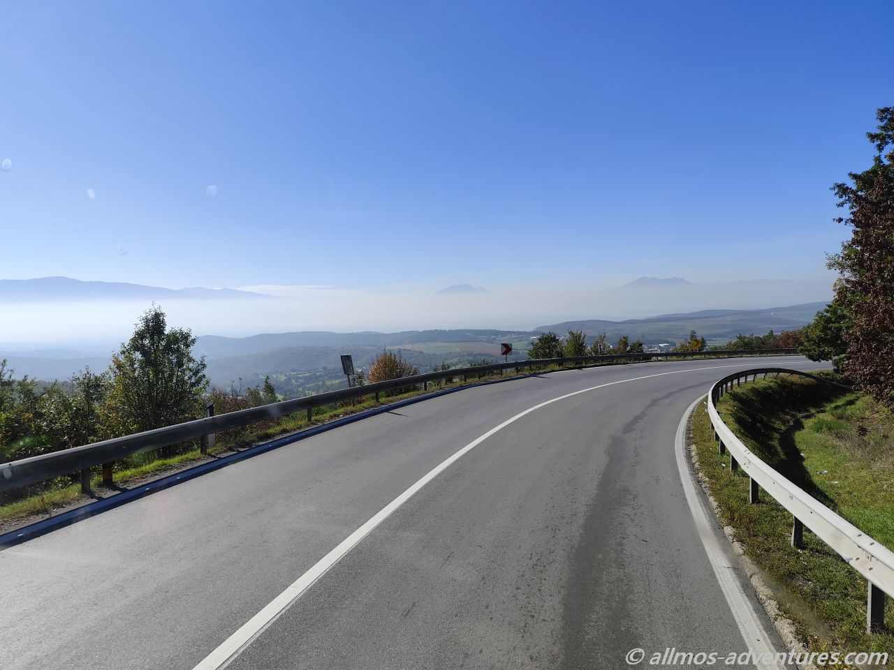 Eigentlich dachten wir, dass wir den Dunstschleier in Gracanica hinter uns gelassen hätten, doch irgendwann befanden wir uns wieder mittendrin. Wir fuhren viel über Landstraße und durch herbstlich gefärbten Wald. Obwohl es inzwischen wieder klar und der Himmel blau war, so trugen die Berge vor uns einen Wolken-Schal. Nur die Spitzen und der Sockel schauten raus. Für zwei Ausfahrten ging es dann auf die Autobahn, die uns nach Prizren brachte.