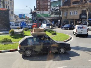 Mit Parkplätzen scheinen wir seit gestern kein Glück zu haben. Denn auf dem eigentlich großen geschotterten Areal befand sich heute der Wochenmarkt. Naja, wenn ich bei P4N reingeschaut hätte, dann hätte ich gewusst, dass mittwochs Markt und das Parken nicht gestattet bzw. ganz unmöglich ist. Aber so schlau war ich nicht. Wir fuhren also erstmal weiter geradeaus, um dann vor dem ersten Kreisverkehr in Prizren im Stau zu stehen. Die Ortsdurchfahrt ist wegen einer Baustelle in diese Richtung gesperrt. Doch aus der Stadt raus kam jede Menge Verkehr.