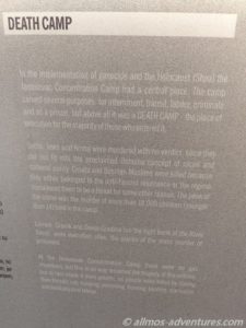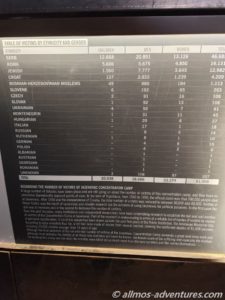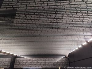 Zunächst sahen wir uns in dem kleinen Museum um. Der Eintritt ist kostenfrei. Erklärungen sind auf kroatisch und englisch zu finden. Neben Schautafeln gibt es Bildschirme mit wechselnden Fotos und Videoaufnahmen. Im Eingangsbereich liegt ein dickes Buch, welches die Namen der im Konzentrationslager Jasenovac hingerichteten Menschen aufführt. Die Namen aller verstorbenen sind auf Glasplatten gedruckt, die im Museum von den Decken hängen. Unfassbar viele Menschen mussten ihr Leben lassen. Beinahe 82.000, mehr als die Hälfte waren Serben, ein Viertel der Toten waren Kinder.