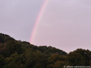 Es war also nicht verwunderlich, als der Wind um kurz vor 7 Uhr etwas auffrischte. Frank drehte draußen noch schnell ein Video. In westliche Richtung zeichnete sich ein Regenbogen ab. Die Sonne versuchte von Osten her durchzubrechen, die Regenwolken waren jedoch stärker. Daher bauten wir schnell das Dachzelt ab. Während Frank noch ein wenig hinten liegen blieb, machte ich es mir mit der Bettdecke in der Doka bequem. Emma verzog sich in ihre Box. Bettdecke und Doka passte ihr nicht.