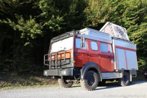 Eine Wetter-App hatte für 7 Uhr Regen gemeldet, weswegen wir nicht das komplette Dachzelt aufgebaut hatten, sondern unser Schildkröten-Tuch. Dies hatte den Vorteil, dass wir es schneller demontieren können, sollte der Regen einsetzen.
