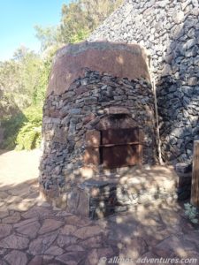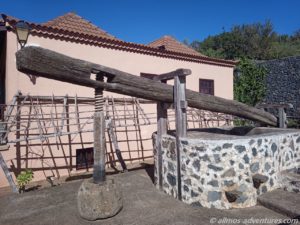 Bevor wir in den Nationalpark Garajonay fuhren, sah ich mich noch kurz im Centro de Visitantes um. Der verheerende Waldbrand im Sommer 2012 fügte dem Lorbeerwald sehr große Schäden zu. Im Besucherzentrum wurde ausgiebig darüber informiert. Im Vorgarten stand eine alte Weinpresse. Ein Schaubild zeigte, wie damals der Wein mit dieser hölzernen Weinpresse in dem Steinbecken gepresst wurde. Noch bis vor wenigen Jahrzehnten wurde so der Wein auf La Gomera gewonnen.