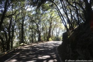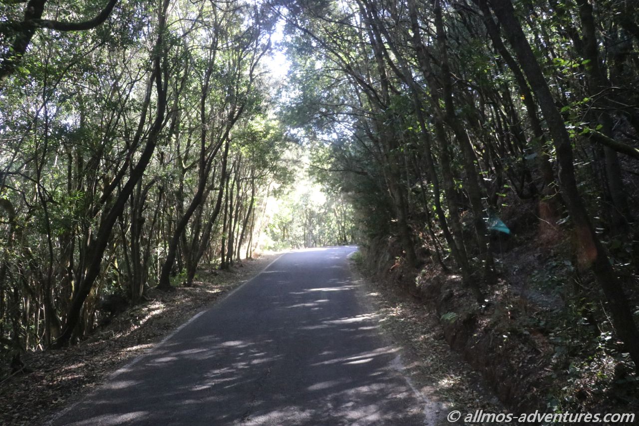 Anstatt den Nationalpark Garajonay zu umrunden, fuhren wir einmal quer durch ihn hindurch. Direkt zu Beginn der Strecke kamen uns zwei Damen in einem Cabrio entgegen, die nicht nur zu schnell den Berg hinunter fuhren, sondern auch noch die Kurve schnibbeln mussten. Frank wollte ein wenig zur Seite ausweichen, doch dort befand sich kein Boden mehr, weil sich dort eine Stelle befand, wo das Regenwasser ablaufen kann. Puh, gerade noch mal Glück gehabt.