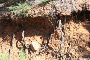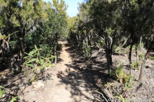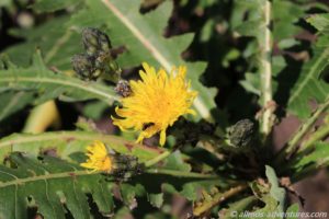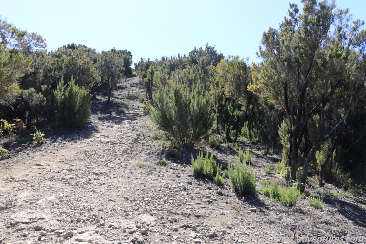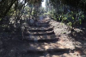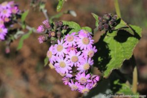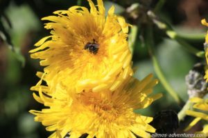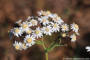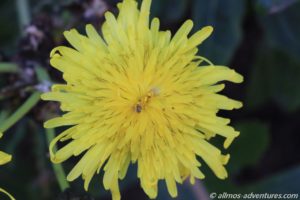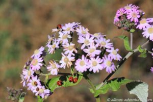 Anstatt in der Sonne lief ich nun kurze Passagen auch mal im Schatten. Doch das wurde im laufe des Weges immer weniger. In die Erde waren „Stufen“ geformt worden, die den Weg einfach zu begehen machen sollten. Ich erfreute mich an den hohen Löwenzahn-ähnlichen Pflanzen, die von den Insekten gut besucht wurden. Auf einer lilafarbenen Kamille hatte sich eine ganze Marienkäferfamilie niedergelassen.