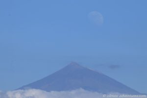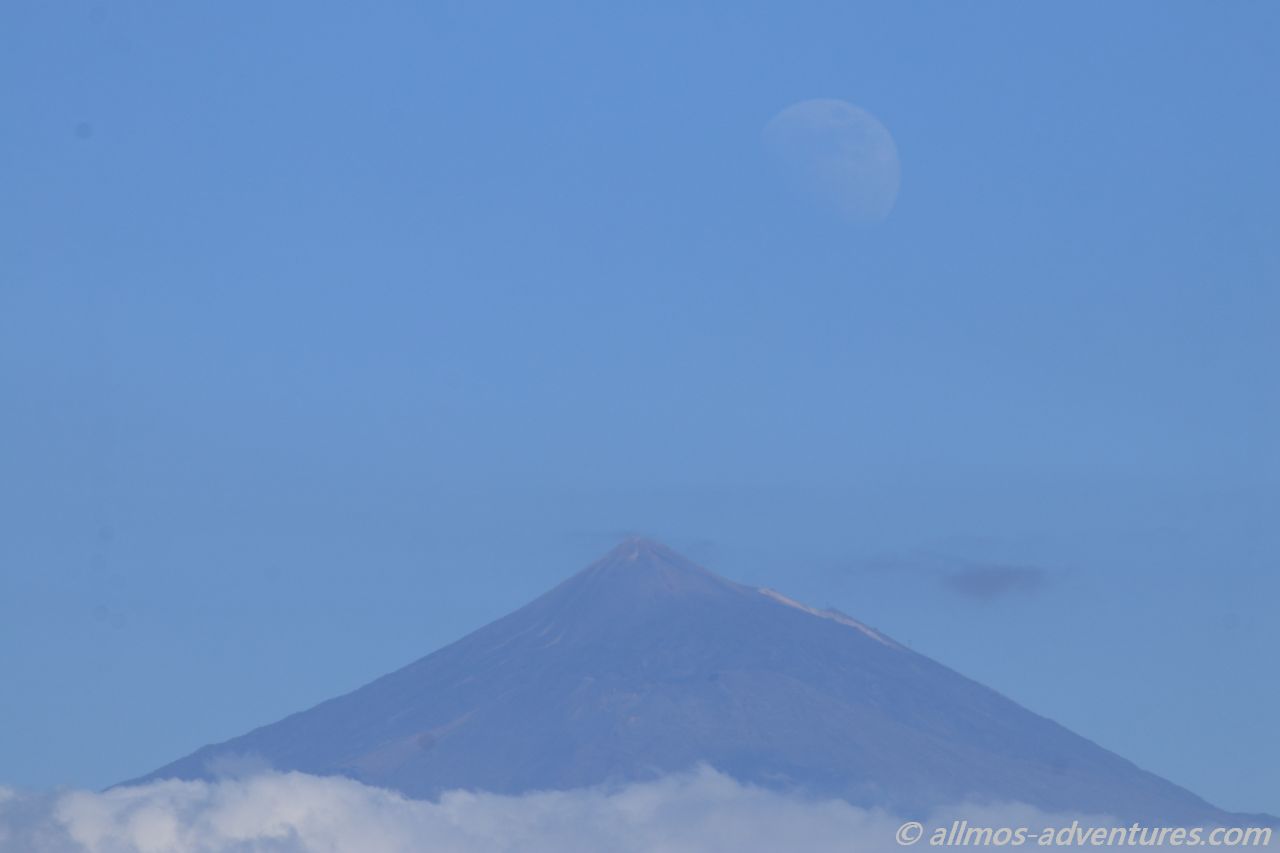 Zwischenzeitlich hatte sich ein Wolkenband vor Teneriffa geschoben. Nur noch die Spitze des Teide schaute daraus hervor. Später ging der Mond genau beim Teide auf. Auch wenn er nur schwach zu erkennen war: er war da.