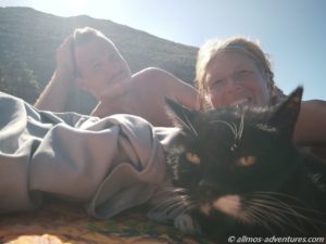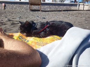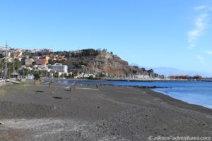 Zwischendurch wurden wir von Windböen eingesandet. Das war weniger schön. Emma durfte auch ihre Pfötchen auf den schwarzen Strand von La Gomera setzen. Tatsächlich blieb sie anschließend auch etwas bei uns auf der Decke liegen. Zum Nachmittag hin nahm der Wind an Stärke zu und wir flüchteten in Allmo.