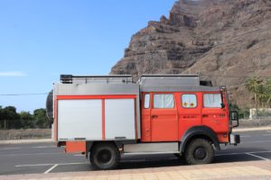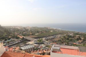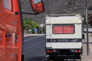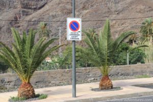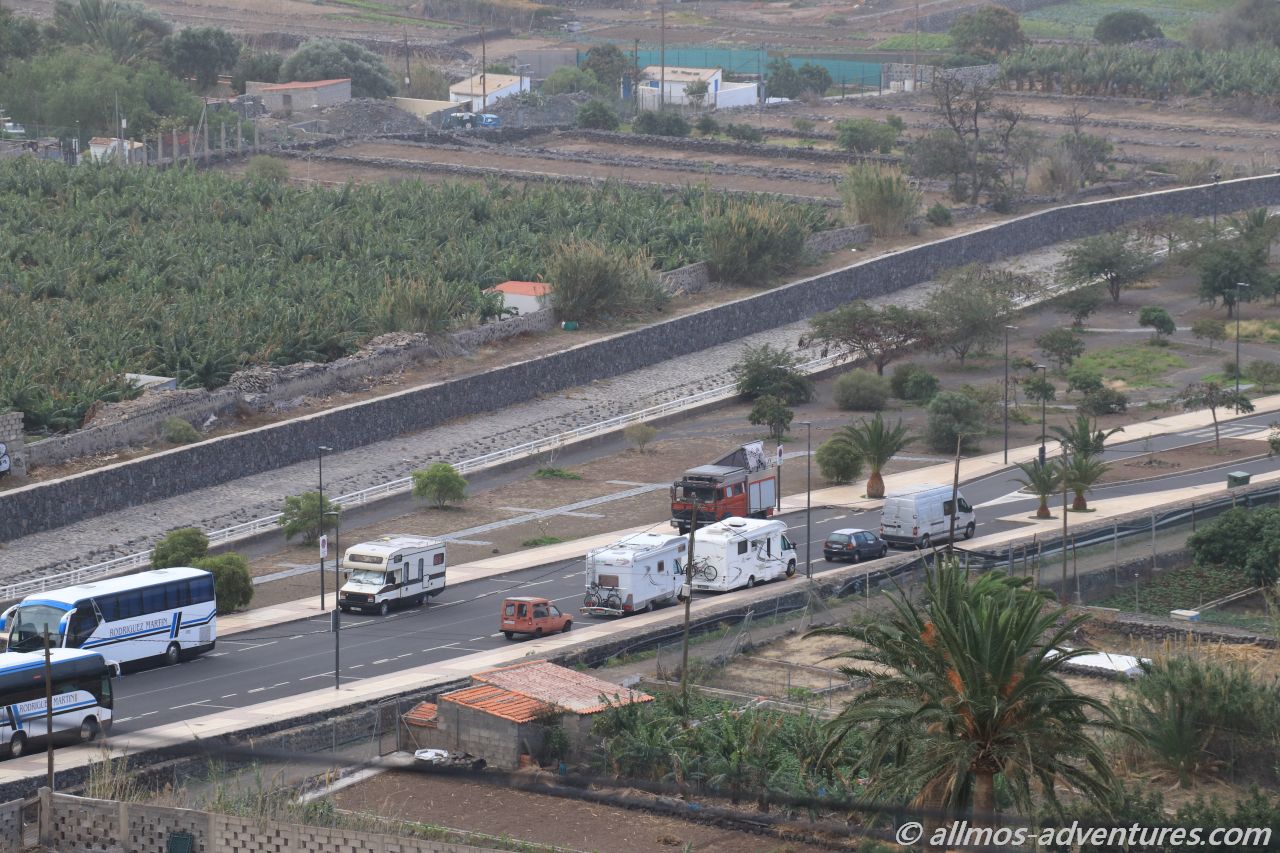 Wir schlängelten uns immer weiter hinunter, passierten das Künstlerdorf El Guro und erreichten schließlich Valle Gran Rey. Die Hauptstraße endete in einer Sackgasse, in der (man mag es kaum glauben), das Parken ausschließlich für Camper erlaubt ist. Nur dumm, dass die Straße leicht abschüssig ist, und man zum halbwegs gerade stehen, etwas unter die Reifen legen muss. Dies scheint aber toleriert zu werden, denn jeder stand auf Keilen, Steinen oder beidem.