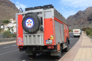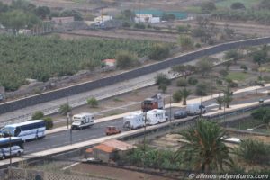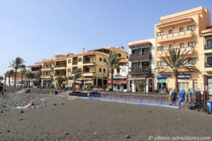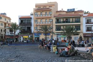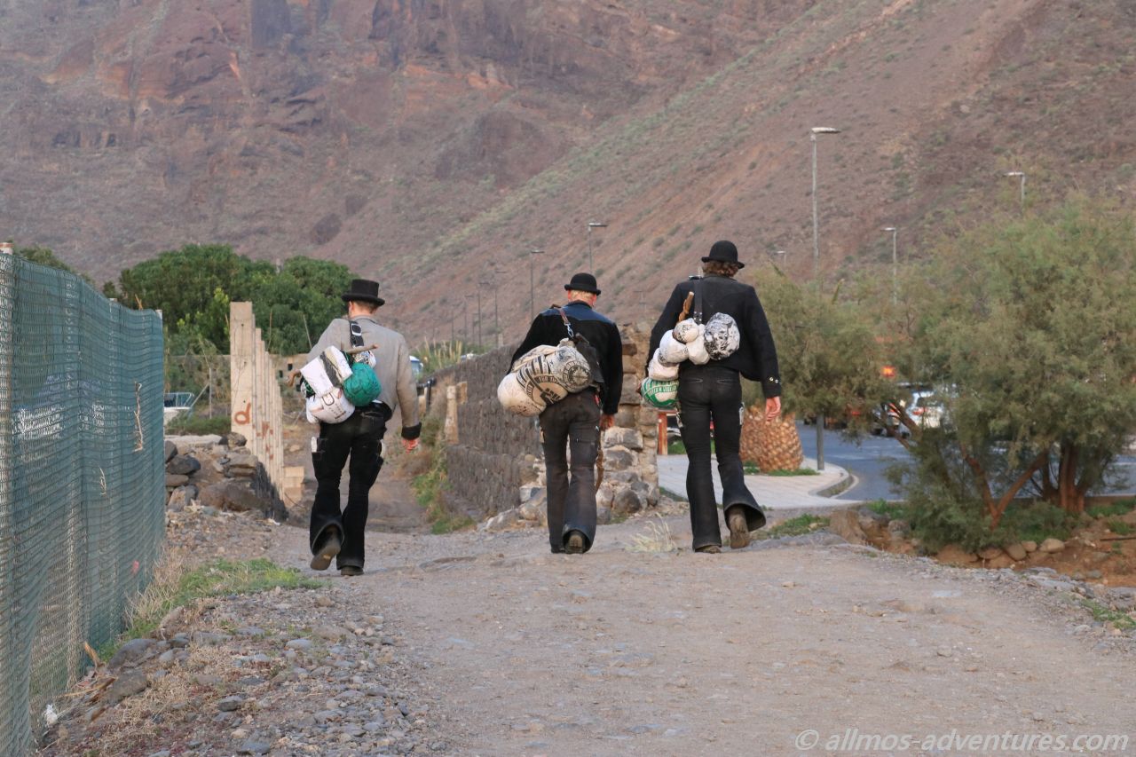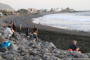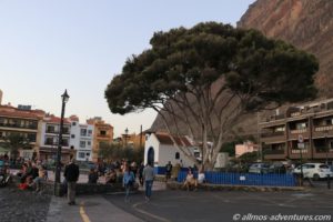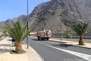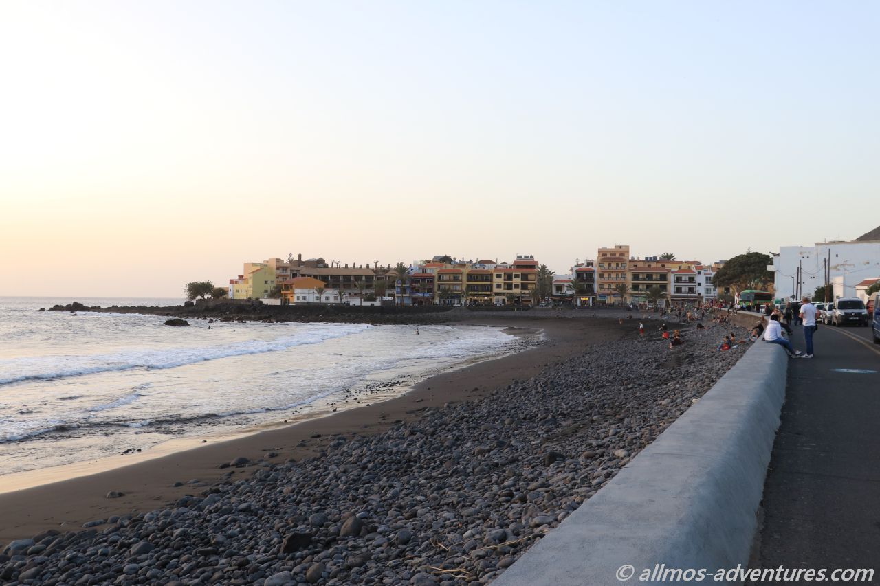 Frank kam anschließend in den Genuss einer kleinen Rundfahrt durch Valle Gran Rey. Die Apotheke befand sich im Ortsteil Playa, dort wo in den Sonnenuntergang getrommelt wird. Anschließend fuhren wir am Meer entlang noch zu Spar. Eine ausreichend große Lücke war am Straßenrand frei und ich hüpfte schnell in den Supermarkt, um Wasser (direkt 2 Sechser-Packs), Cola und heiße Tassen zu besorgen. Das mit dem Wasser hat den Vorteil, dass ich dass dann nicht die 1,2 km zu Fuß zu Allmo schleppen muss.