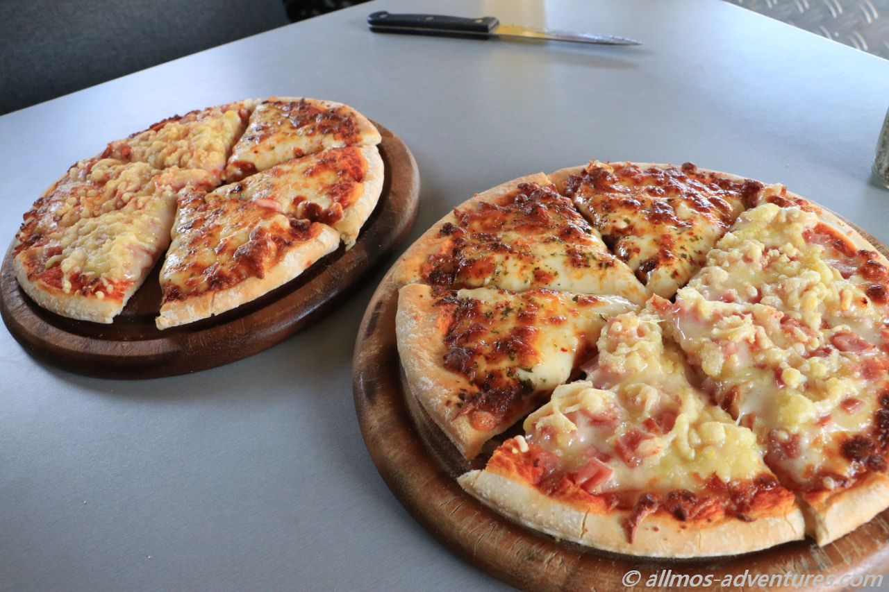 Zum Abendessen gab es heute einfach nur die Mini-Pizzen von Mercadona ganz ohne Extras. Frank hatte nicht viel Appetit und da mussten die Pizzen nicht noch zusätzlich belegt werden. Schnell waren diese in unserem Backofen zubereitet. Freundlicherweise hatte der Wind auch nachgelassen, so dass ich die Küchenseite (die sich natürlich wieder auf der Windseite befand) gut nutzen konnte.