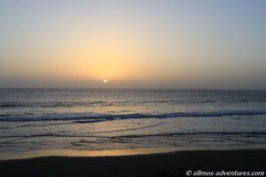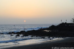 Zum Sonnenuntergang vernahmen wir das Trommeln vom Strand. Es gehört wohl zu den abendlichen Ritualen, dass irgendwer trommelt, auch Jonglage-Künstler sollen dazu auftreten. Also so wie am Mallory Square in Key West (Florida, USA). Wir ließen uns diese Vorstellung heute entgehen. Nicht nur weil Frank sich noch schonen muss, sondern auch weil der Calima-Dunst die Sonne eingehüllt hatte. Morgen ist schließlich auch noch ein Tag.