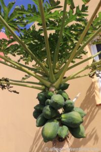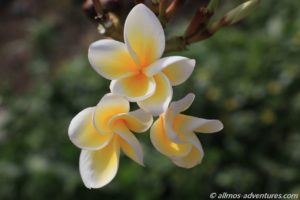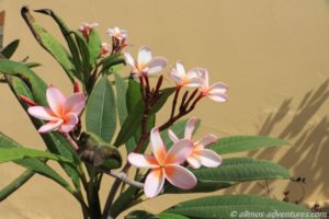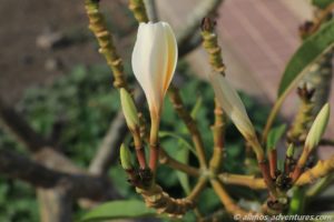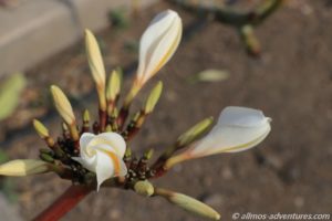 Bei meinem Spaziergang am Morgen zum Supermarkt entdeckte ich, dass wir neben einem kleinen Plumeria/Frangipani-Baum stehen, der die ersten Blüten entwickelt. Der Anblick freute mich und wer weiß, wie lange wir hier noch stehen und ich ihn beim Erblühen weiter beobachten kann. Auch bei meinem Spaziergang zum Strand entdeckte ich im Dorf einen Plumeria-Baum, der schon ein paar geöffnete Blüten hatte.