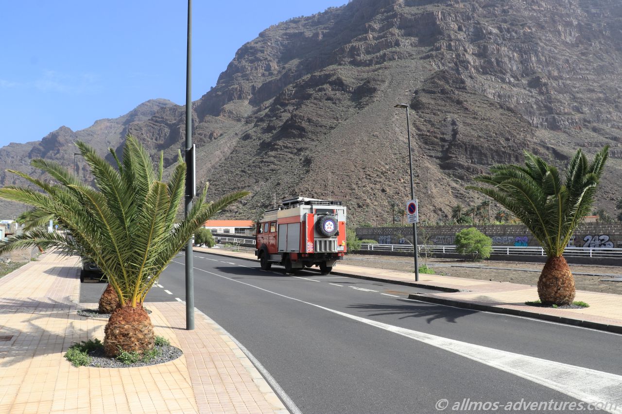 Eigentlich ist es kein Traumplatz für uns. Aber zweckmäßig ist es. Zum einen gibt es keinen bzw. kaum Durchgangsverkehr und zum anderen habe ich von dort aus die Möglichkeit die Umgebung zu erkunden während Frank sich in Ruhe auskurieren kann. Denn eins ist klar: Wir werden Valle Gran Rey erst verlassen, wenn er wieder fit ist.