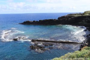 Über einen kleinen Wasserfall wird Wasser in das Becken gepumpt. Bei stärkerem Wellengang fließt das Wasser über die durchlässige Befestigungsmauer in das Becken hinein. Davon waren wir jetzt jedoch weit entfernt.