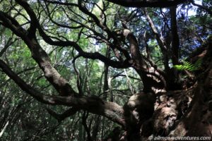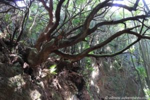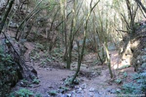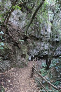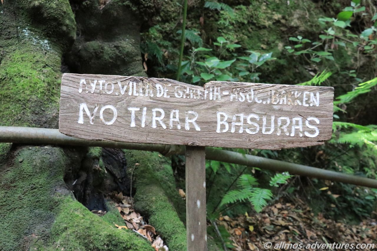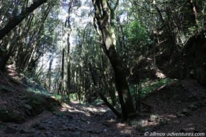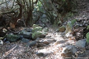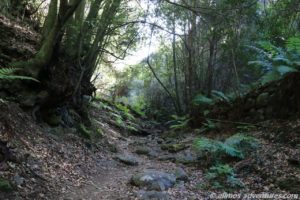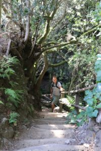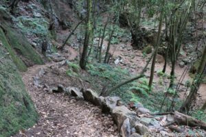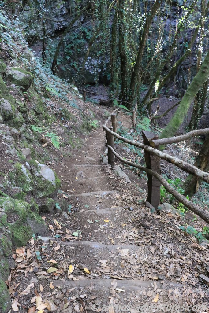 Der Weg führte uns immer tiefer in den Wald hinein. Die Sonne blinzelte durch das kaum vorhandene Laub der Bäume, was dem Wald eine schöne Stimmung verlieh. Über angelegte Stufen, die mit Holz aus dem Wald vor dem Abrutschen der Erde gesichert wurden, gingen wir bergab in das Barranco hinein. Die Geländer waren ausschließlich aus Holz gefertigt, welches der Wald hergab. Kein Pflock und keine Querstreben waren identisch. Wir waren darüber sehr positiv überrascht. Es sollten viel öfter Dinge, die vor Ort vorhanden sind, eingesetzt werden, anstatt Holz für viel Geld teuer einzukaufen und dann auch noch dorthin transportieren zu lassen.