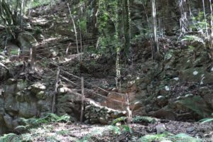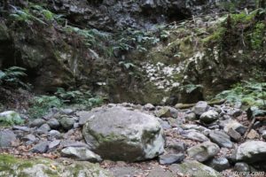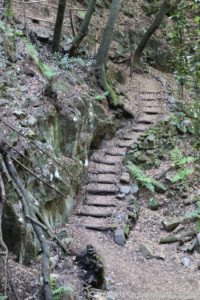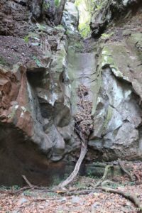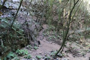 Wir folgten dem Pfad neben dem trockenen Flusslauf, der uns zunächst etwas bergauf und dann noch ein ganzes Stück, wieder über Treppenstufen, bergrunter führte. Unten angekommen bewunderten wir den trockenen Wasserfall, der nun als Laubfall oder Baumstammfall diente. Wie glatt der Felsen an der Stelle wo das Wasser fließen müsste, über die Jahrtausende geschliffen worden war.