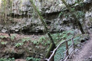 Wir freuten uns über die hohen Felswände, die wir passierten. Diesmal wies kein Schild auf mögliche Gefahren durch Steinschlag hin und der Steinhaufen, den wir passierten, sah nicht so aus als ob der dort schon ewig liegen würde. Auch die Bäume bewegten sich im Wind und knirschten und knarzten. Ganz ungefährlich war unser Spaziergang durch den Wald wohl nicht. Und dann hatten wir den als La Catedral bezeichneten Bereich erreicht. Die halbrunde Felswand lag vor uns, an der wir gerade noch vorbei gelaufen waren.