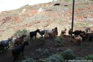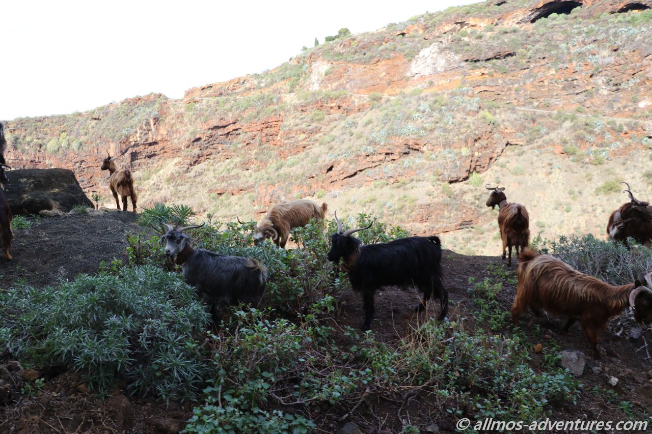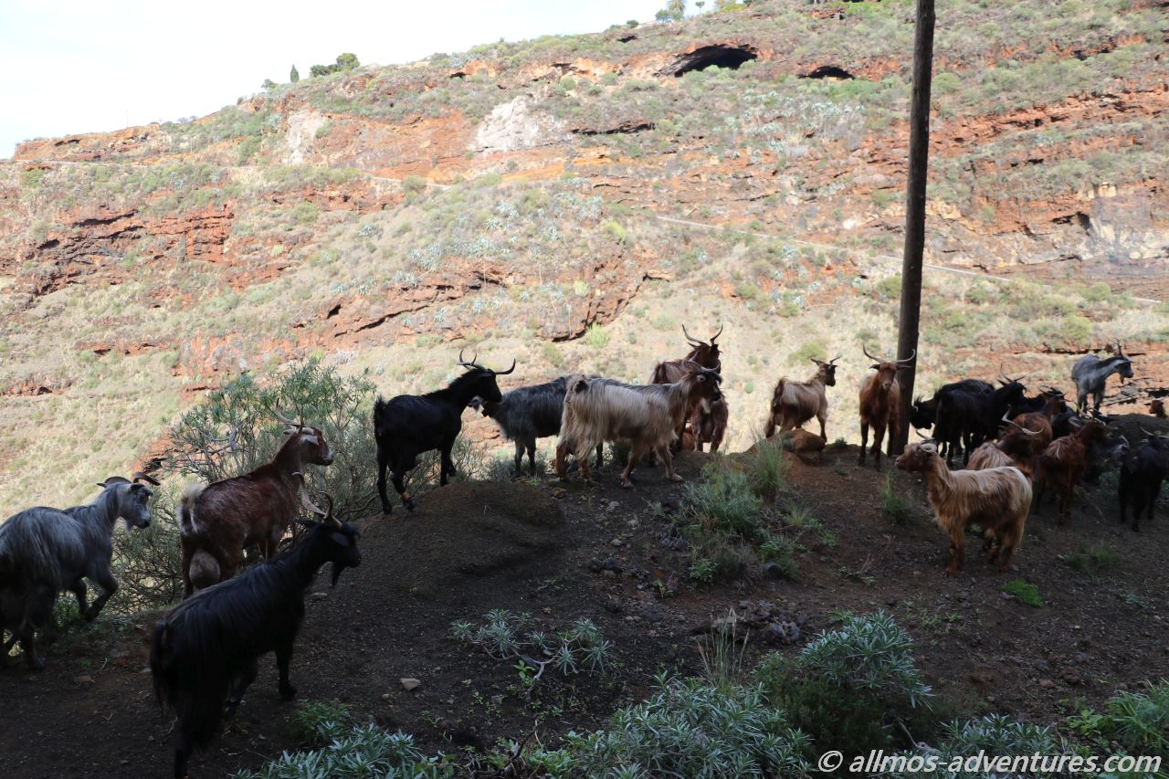 Auf dem Weg nach Las Tricias umrundeten wir unzählige Barrancos. Manchmal konnten wir Höhlen in den Felsen erkennen oder ganze kleine Häuser. Eine Ziegenherde ohne Hirten, aber mit Glöckchen kreuzte unseren Weg und machte auf dem Grünstreifen für uns Platz.