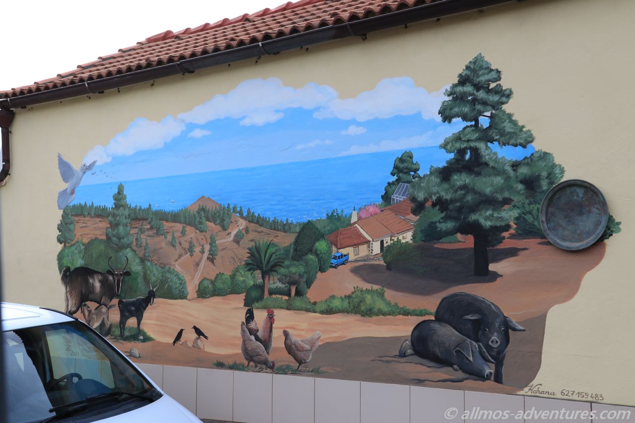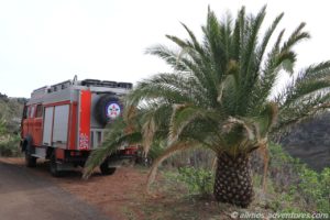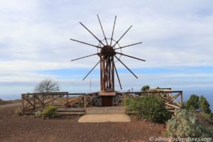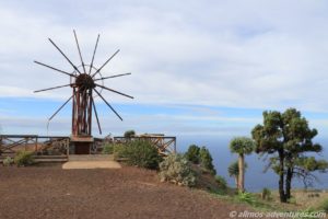 Die beiden Autos standen immer noch am Rand des Zugangs zum Gofio Museum. Frank parkte Allmo in der nächsten Haltebucht (dort stand kein Privado-Schild) neben einer Palme. Ich sah mir nur schnell die alte Gofio-Mühle aus Holz an und dann fuhren wir auch schon weiter. Denn dort wollten wir nicht stehen bleiben und heute kam auch keine Wanderung mehr in Frage. Ich konnte nicht mehr so viel laufen und Frank wollte nicht.