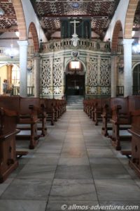 Im Inneren war diese Kirche auch sehr düster, wobei die dunkelbraune Holzdecke mit helleren Farbmustern bemalt war, was sehr interessant aussah. Und tatsächlich verfügte auch diese Kirche über eine Orgel. Zu langsam wird das aber unheimlich. Hinter dem Altar war eine kleine Krippe mit großen Figuren aufgebaut.