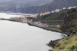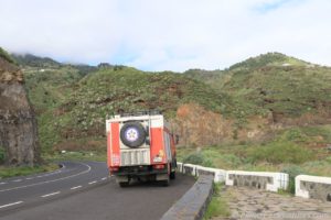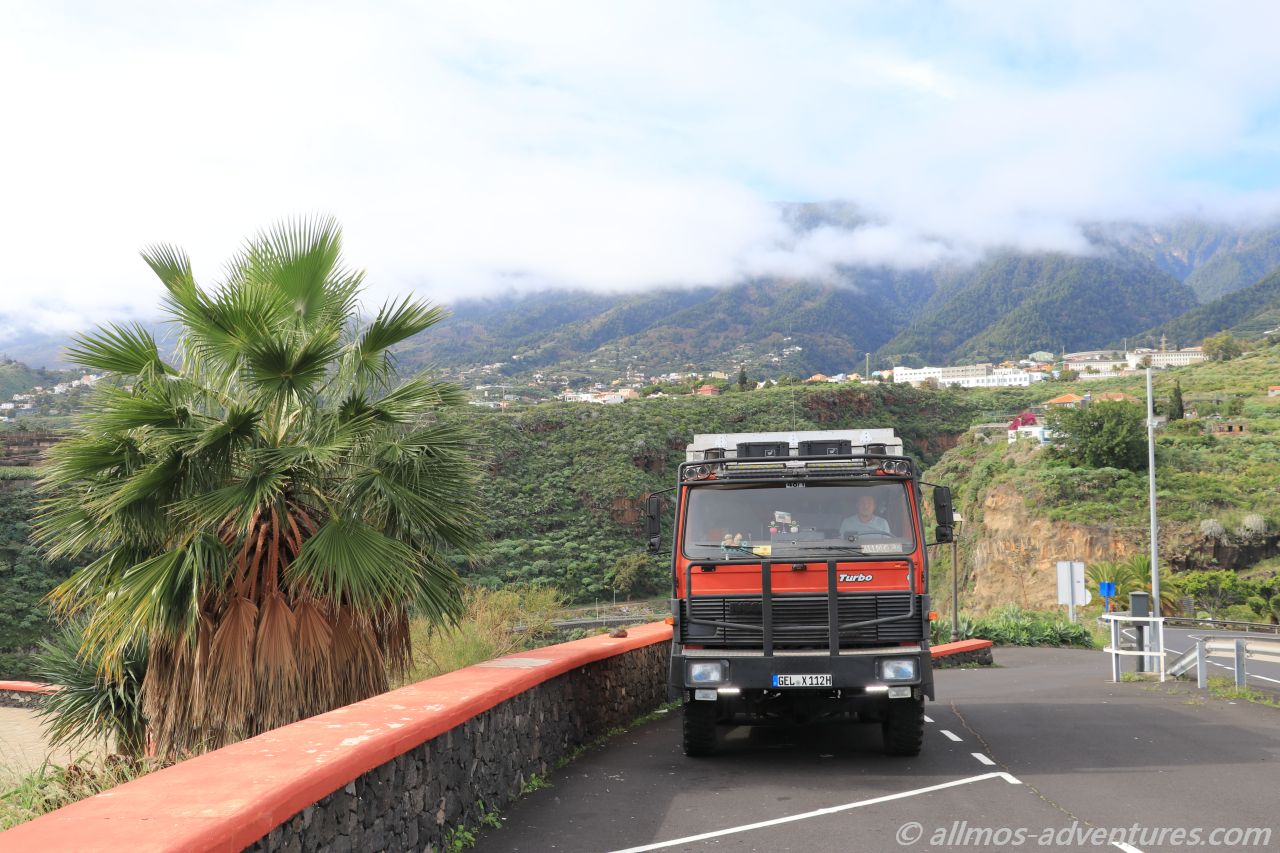 Auf dem Weg zu unserem Übernachtungsplatz stoppten wir zunächst am Mirador Barranco del Carmen, von wo aus wir auf unseren Parkplatz und Santa Cruz blickten. An der günstigsten Tankstelle der Insel (einer Plenoil nördlich von Santa Cruz) stillten wir Allmos Durst. Einmal hatte Frank schon umgepumpt und davon hatten wir bereits die Hälfte verfahren. Für den Liter Diesel bezahlten wir 1,199 Euro. Die nächstgünstigste Tankstelle verlangt 12 Cent mehr. Üblich ist allerdings ein Preis von 1,46 Euro den Liter. Dank unserer Zusatztanks können wir das ja zum Glück ein wenig Steuern und ergriffen daher heute die Gelegenheit günstig zu Tanken. Bei 110 getankten Litern und einem sehr durstigen Allmo sind wir froh, wenn wir ein wenig sparen können.