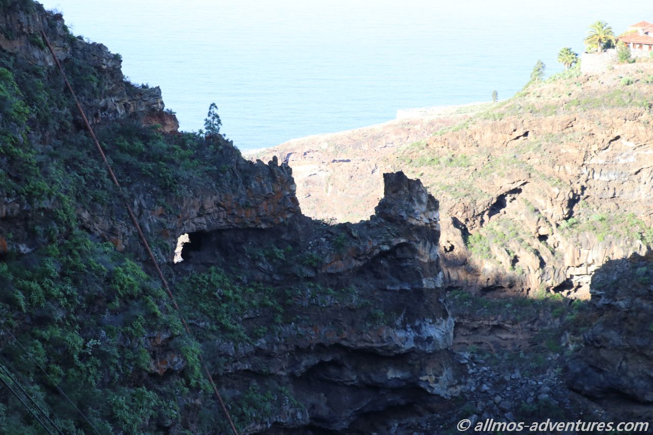 Bis zu der Schmuggler-/Piratenbucht Poris de Candelaria wäre es von unserem Standort nicht mehr weit. Doch die Straße, die dorthin führt, soll sehr schmal und super steil sein (bis zum ersten Parkplatz rund 500 Höhenmeter auf 3,3 Kilometer, bis zum unteren Parkplatz sind es weitere 100 Höhenmeter auf einer Länge von 600 Metern). Letzte Tage hatten wir ja bereits entschieden, dass wir uns das nicht antun werden. Zumal wir vom Parkplatz auch noch einiges hinunter zur Bucht laufen müssten. Wobei die Bucht mit an den Felsen gebauten Hütten schon sehr ansprechend aussieht. Aber nein, dass ist abgehakt.