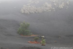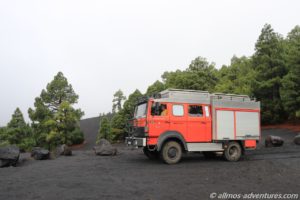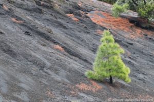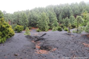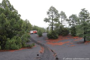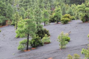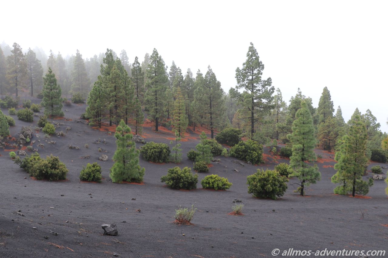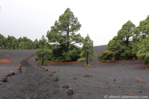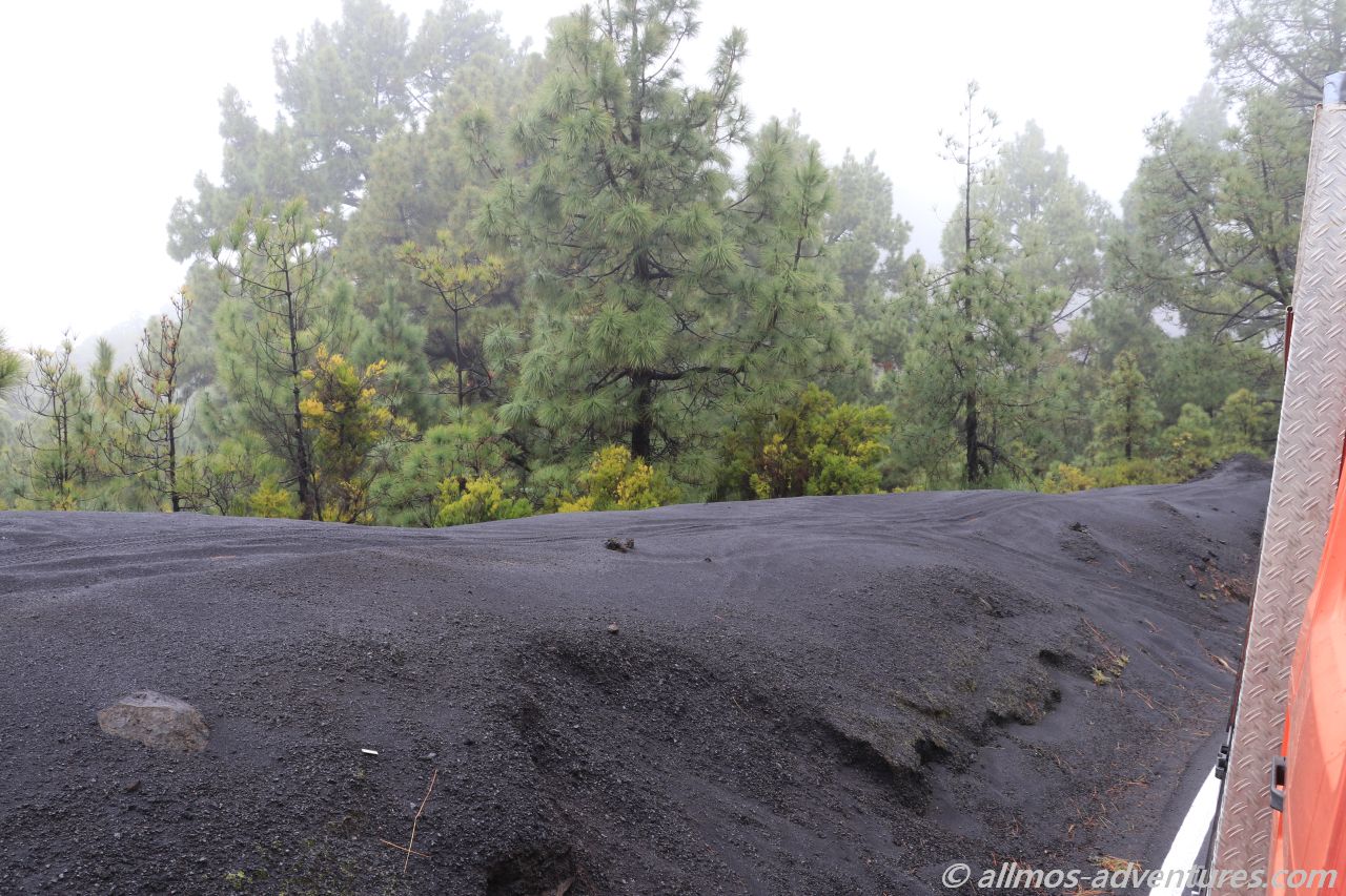 Heute war alles trüb, grau in grau, als wir auf die Straße in Richtung El Pilar abbogen. Zunächst fuhren wir durch die Wälder. Schattig war es dort auch schon letztes Mal, obwohl die Sonne schien. Kurs vor erreichen des Montana Quemada wurden neben der Straße die Spuren des Vulkanausbruchs sichtbar. Der Waldboden war bedeckt von einer grauen Ascheschicht. Vereinzelt wurde die Asche durch Kiefernnadeln bedeckt. Bis von der grauen Asche nichts mehr zu sehen ist werden die Bäume noch einiges an Nadeln abwerfen müssen.