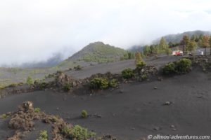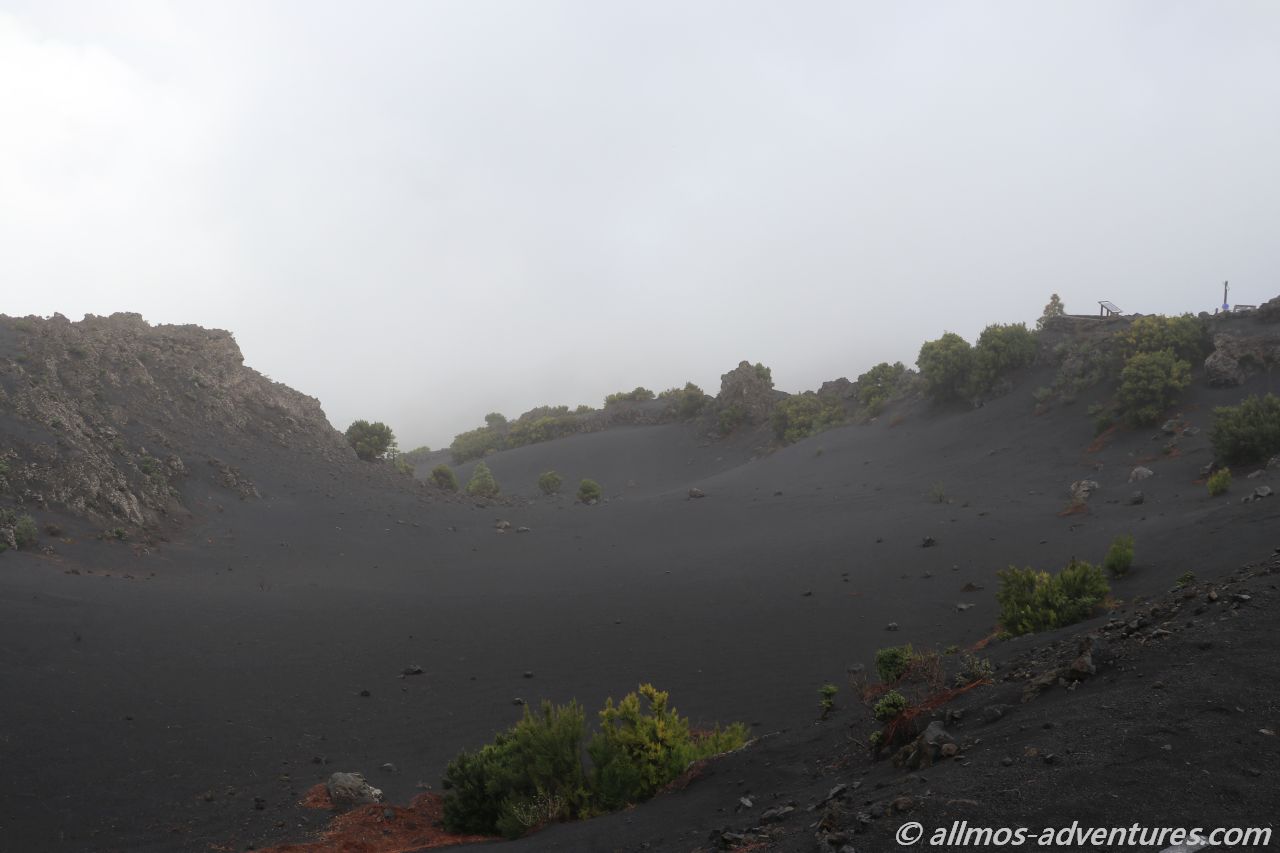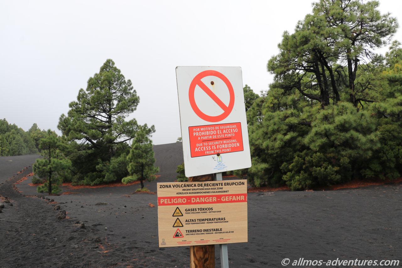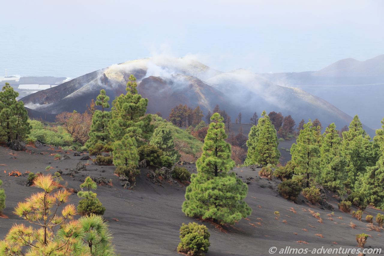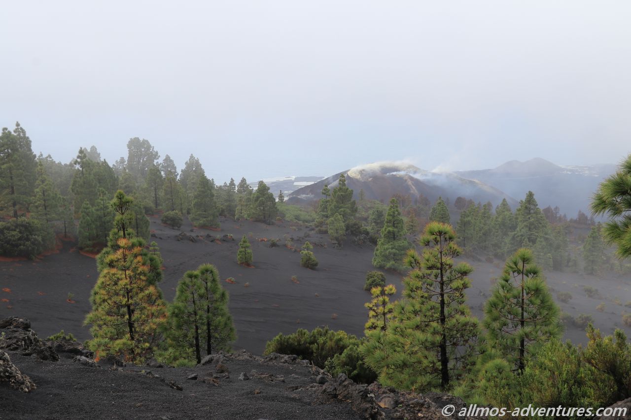 Als wir vor 12 Tagen auf dem Weg zur Area Recreativa El Pilar bereits über die kurvige LP-301 fuhren, stoppten wir weder an der Parkbucht beim Montana Quemada (von dort starten die geführten Touren zu dem Vulkan Tajogaite) noch an dem Mirador Astronomico del Llano del Jable. Dabei hatten wir an dem Tag schönstes Wetter. Der blaue Himmel hätte sich gut als Kontrast zu der grauen Asche und den grünen Bäumen gemacht.