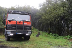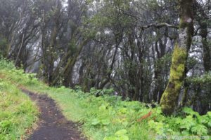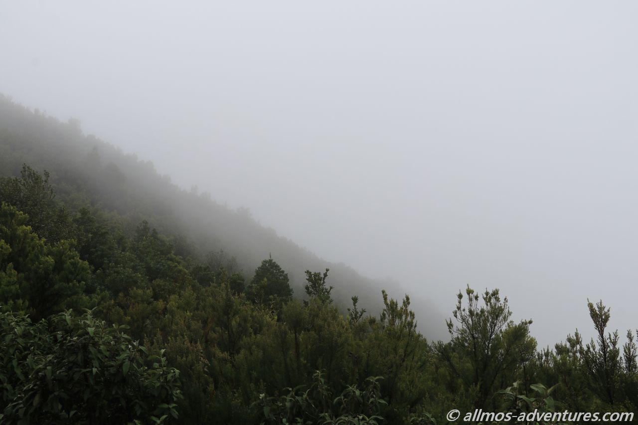 Auf dem Weg in Richtung des markierten Punktes bei Karten-Gockel streifte Allmo so einige Äste und entsprechend pitschnass wurde er. Das eigentlich besondere an de Cumbre Nueva ist, dass man dort Wolkenwasserfälle sehen kann. In rund 1450 Metern Höhe schieben sich die Passatwolken aus Richtung Osten kommend über den Bergkamm und lösen sich auf der Westseite wieder auf. Dies sieht dann aus wie ein Wolkenwasserfall, der über den Bergkamm fällt. Und soll ein sehr interessantes Naturschauspiel sein. Nun gut, heute hing eh alles in Wolken und Wasser hatten wir auch von oben. Nur das sich aus diesen beiden Komponenten dann doch nicht der eigentliche Wolkenwasserfall ergab.