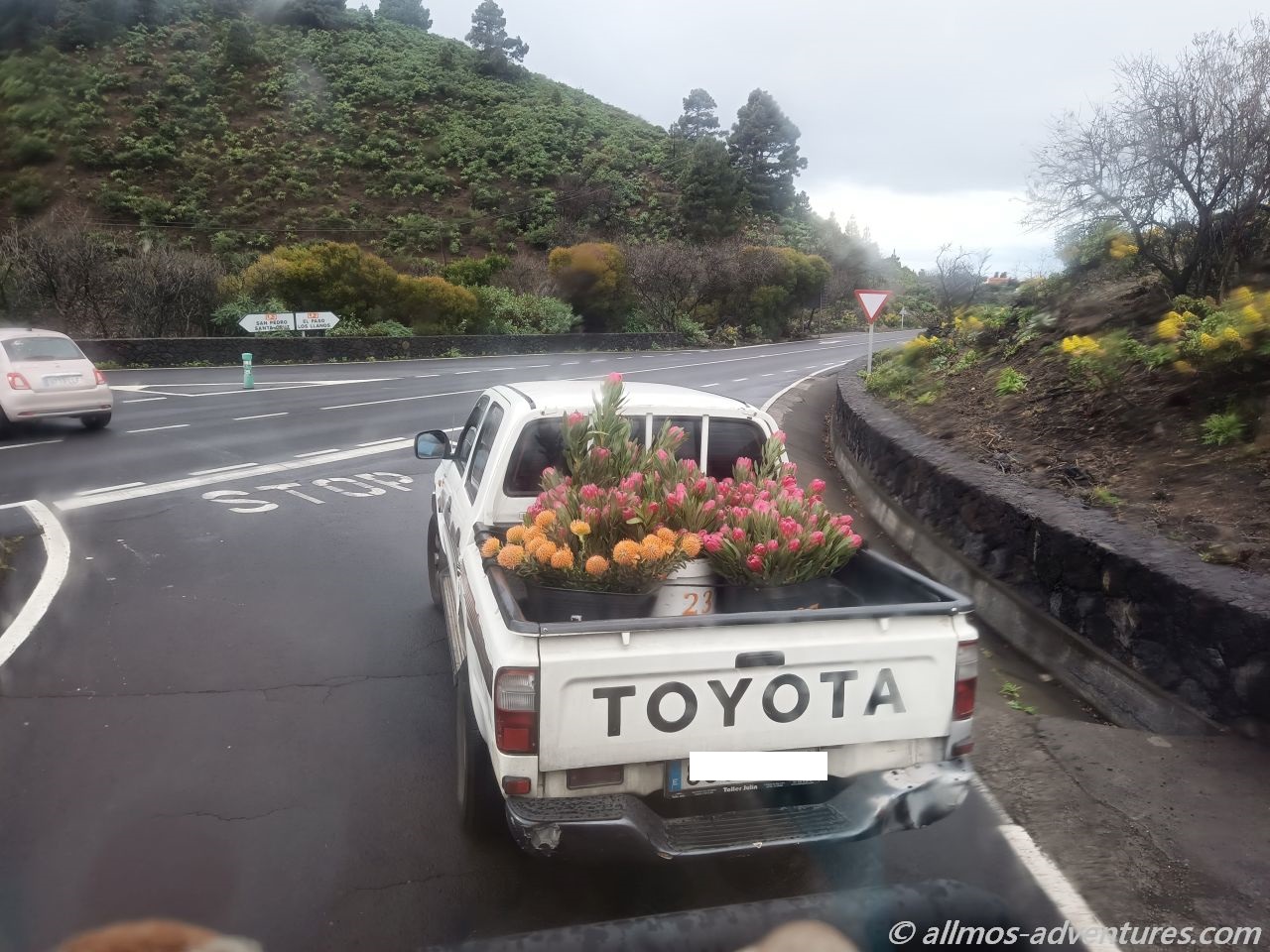 Auf der anderen Seite des Barranco des las Angustias fuhren wir wieder hoch in Richtung Los Llanos. Dort hatten wir bei unserem Stadtspaziergang letztens einen Waschsalon gesehen. Waren uns aber nicht mehr so sicher, wo das war. In der P4N-App waren zwei Salons angegeben, wobei es davon keiner war. Auch Gockel war keine Hilfe. Aber egal. Ein Waschsalon befand sich direkt an der Straße, was ich nicht so schön fand. Der andere lag leider in einer Straße, die für Fahrzeuge schwerer als 3,5 Tonnen gesperrt war. Frank ließ mich an der Hauptstraße raus und ich schleppte zu Fuß die Wäsche dorthin.