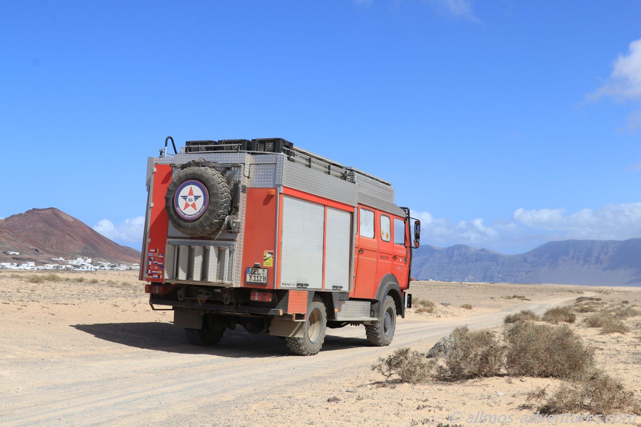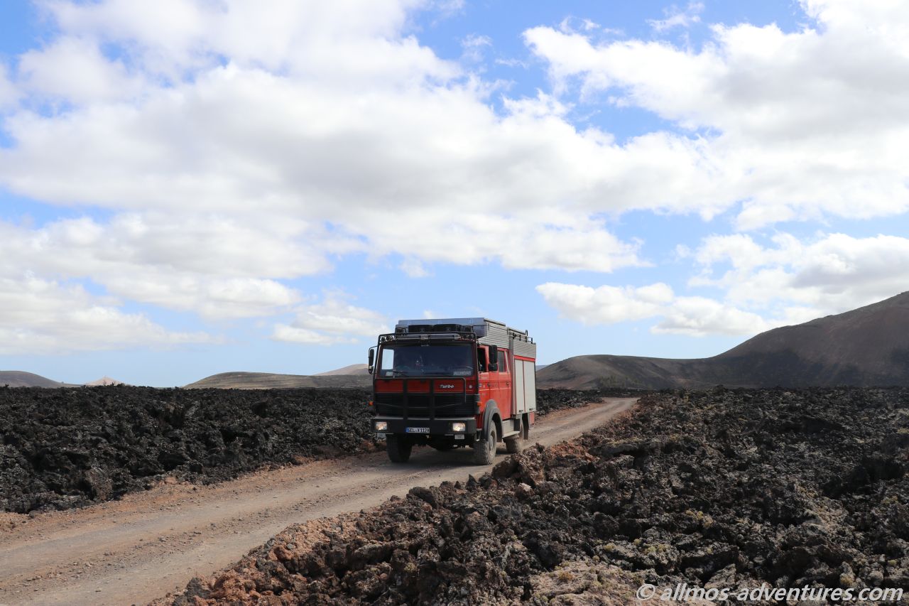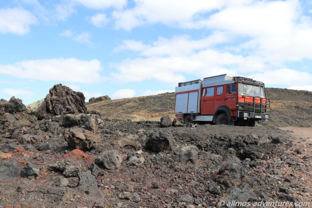 Auf dem Weg zur Caldera de los Cuervos durchfuhren wir ein dünenartiges Gebiet. Der Sand wurde vermutlich von der Sahara dorthin getragen. Die Umgebung leuchtete in einem strahlenden sandgelb. Frank konnte es sich nicht nehmen lassen einen Abstecher vom Teer auf die Piste zu unternehmen. Allmo macht sich in der gelben Umgebung farblich sehr gut.